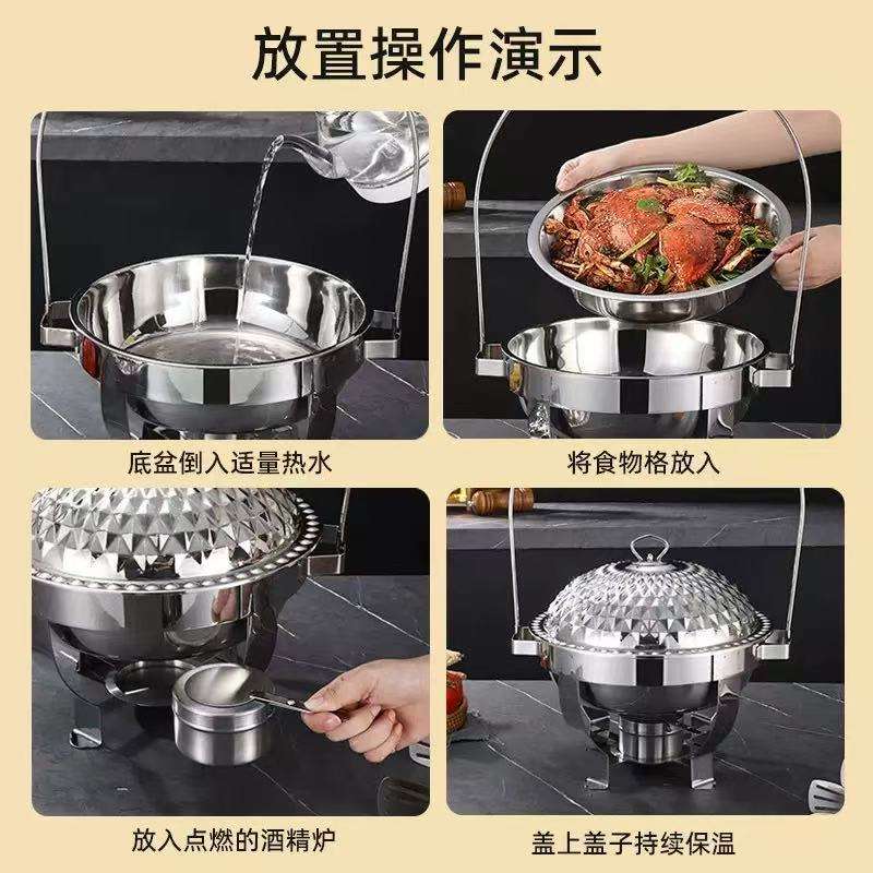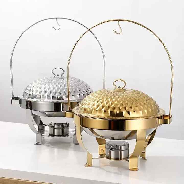 ถาดอุ่นอาหารสแตนเลสเกรดเชิงพาณิชย์ ขนาด 4.5 ลิตร/6 ลิตร/8 ลิตร สีทอง/สีเงิน ฝาปิดแบบแขวน ใช้แอลกอฮอล์ ฝาครอบลายเพชร สำหรับงานจัดเลี้ยง