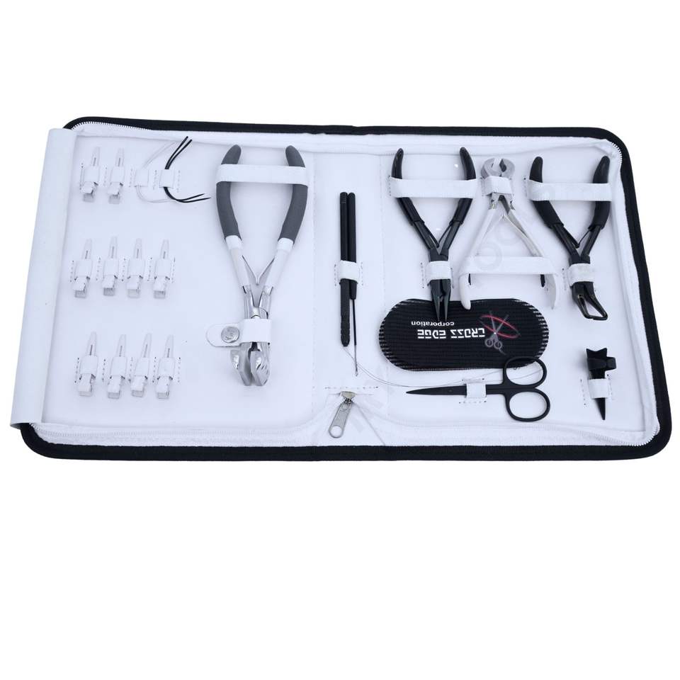 ชุดอุปกรณ์ต่อผมเชิงพาณิชย์ ประกอบด้วยคีมต่อผมแบบไมโครบีด คีมต่อผมแบบเทป คีมตัดกาว และคลิปจัดแต่งทรงผม