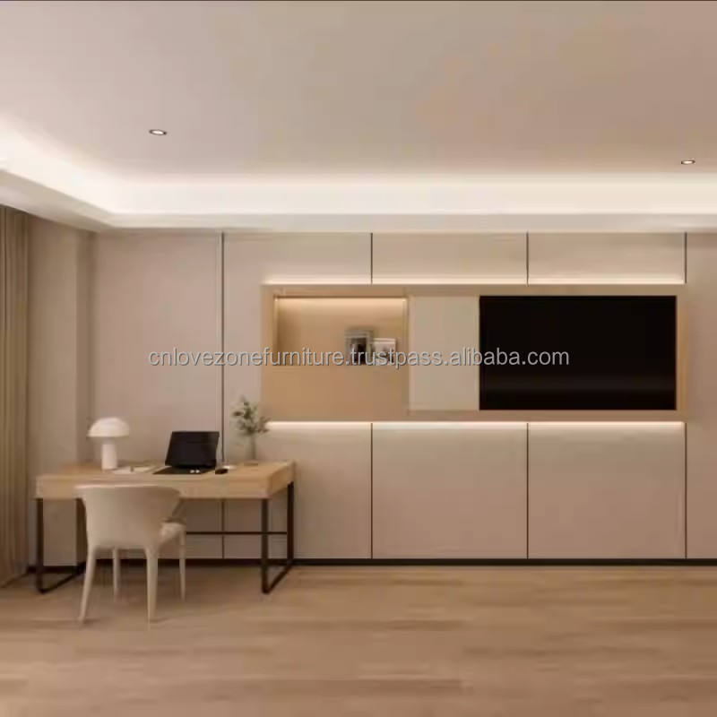 ชุดห้องนอนโรงแรมอพาร์ทเมนท์ทันสมัยระดับ 3 ดาว โครงเตียงไม้ โต๊ะข้างเตียง ตู้เสื้อผ้า ชั้นวางทีวี โซฟาห้องนั่งเล่น