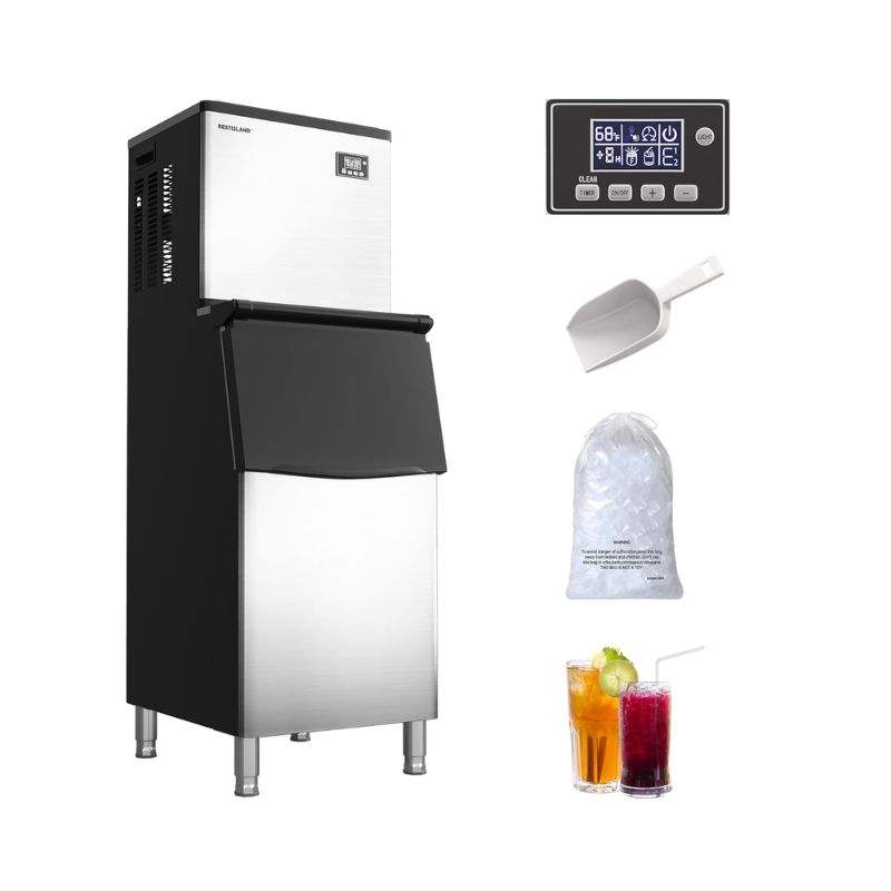 เครื่องทำน้ำแข็งเชิงพาณิชย์, 360 ปอนด์/24 ชม., ถังเก็บน้ำแข็ง 200 ปอนด์, เครื่องทำน้ำแข็งอุตสาหกรรม, ไฟสีฟ้า, สแตนเลส