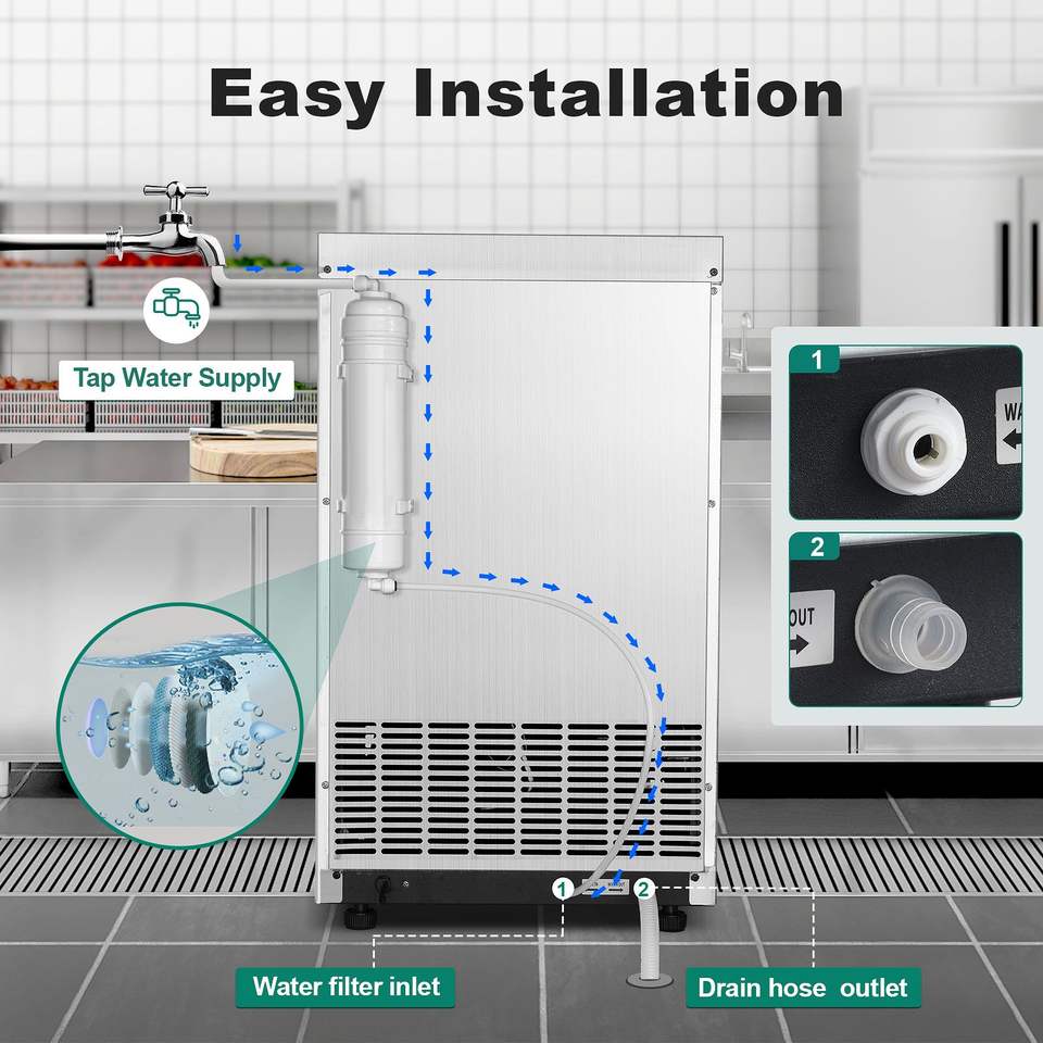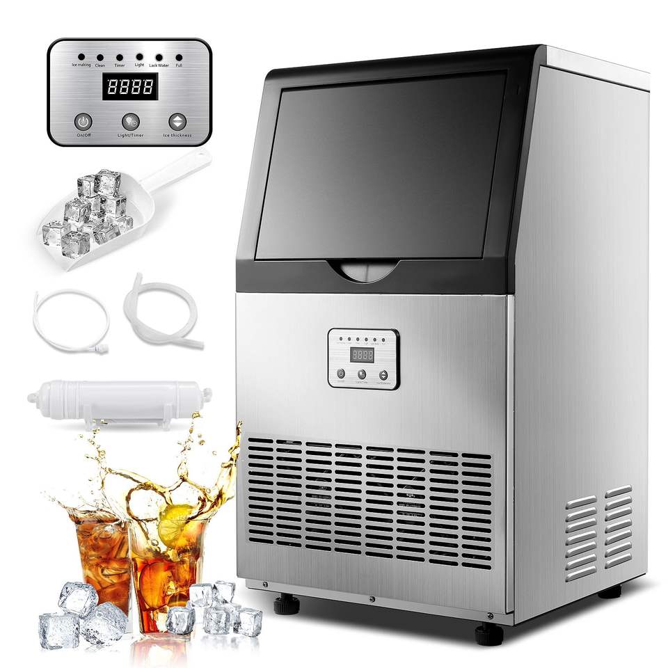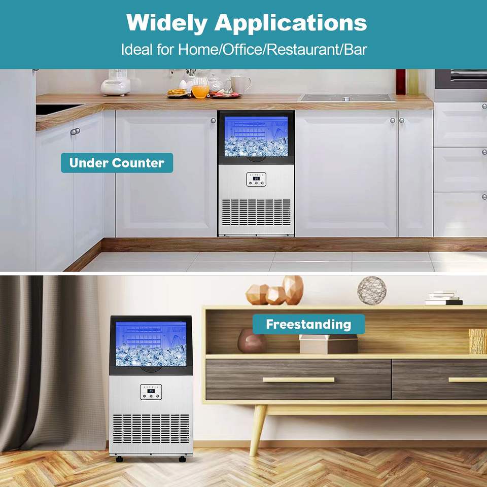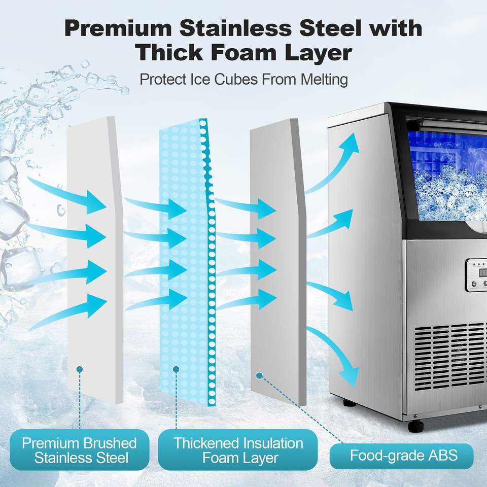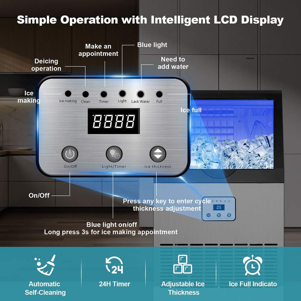 เครื่องทำน้ำแข็งเชิงพาณิชย์ พร้อมระบบทำความสะอาดอัตโนมัติ หน้าจอ LED แสดงผลแบบดิจิตอล แสงสีฟ้า กำลังการผลิต 100-150 ปอนด์/24 ชั่วโมง