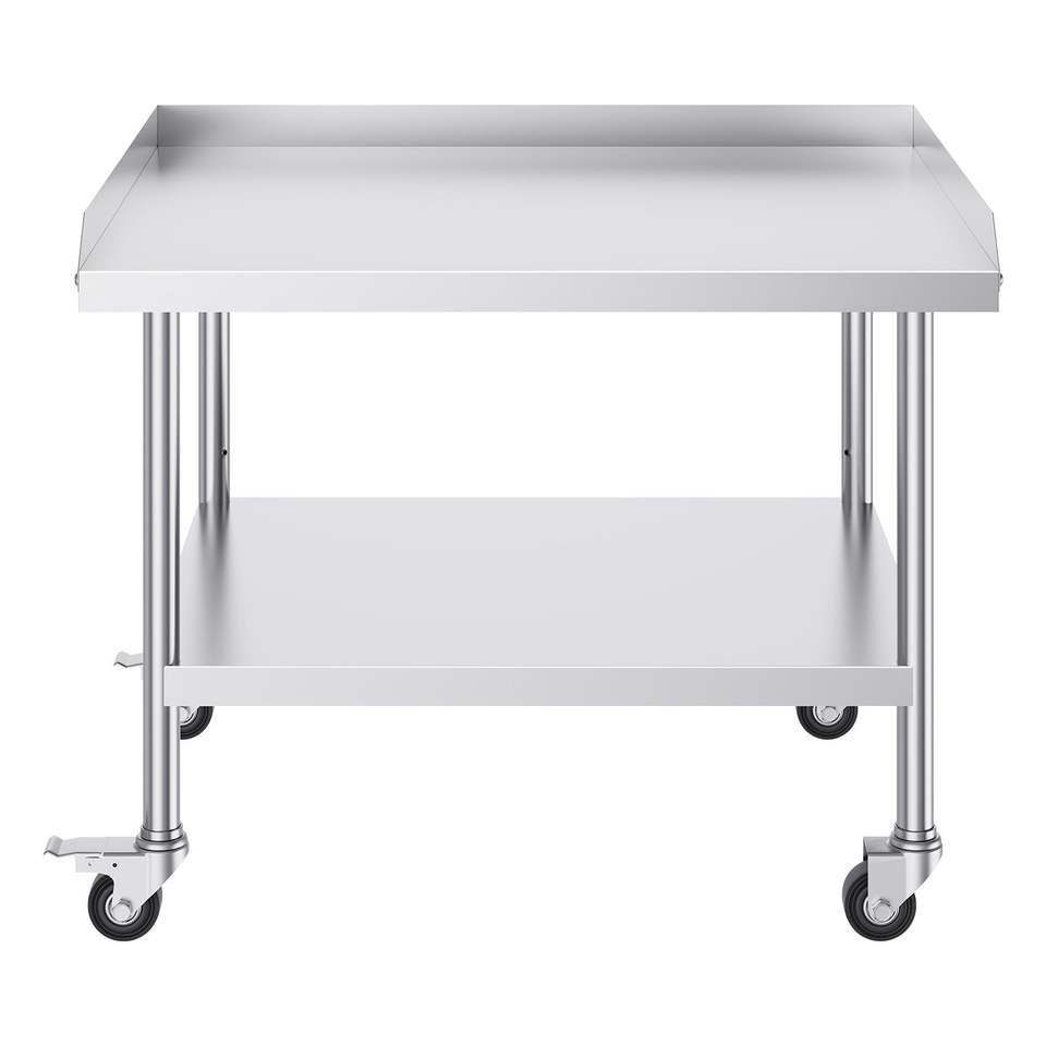 โต๊ะทำงานครัวสแตนเลสสำหรับงานเชิงพาณิชย์ ขนาด 30 x 36 x 30 นิ้ว พร้อมล้อเลื่อน 4 ล้อ แผ่นกันน้ำกระเด็น 3 ด้าน รับน้ำหนักได้มาก