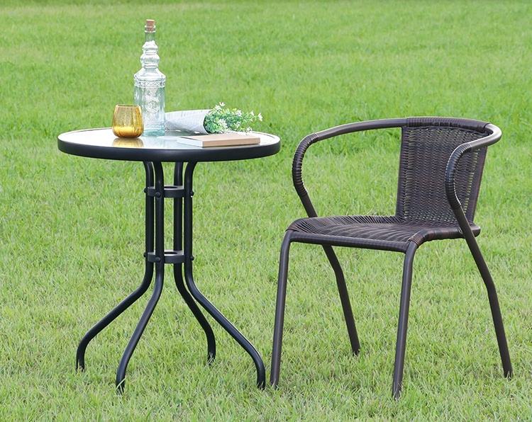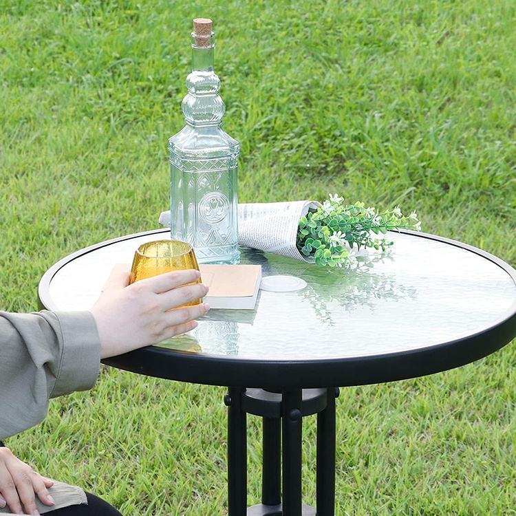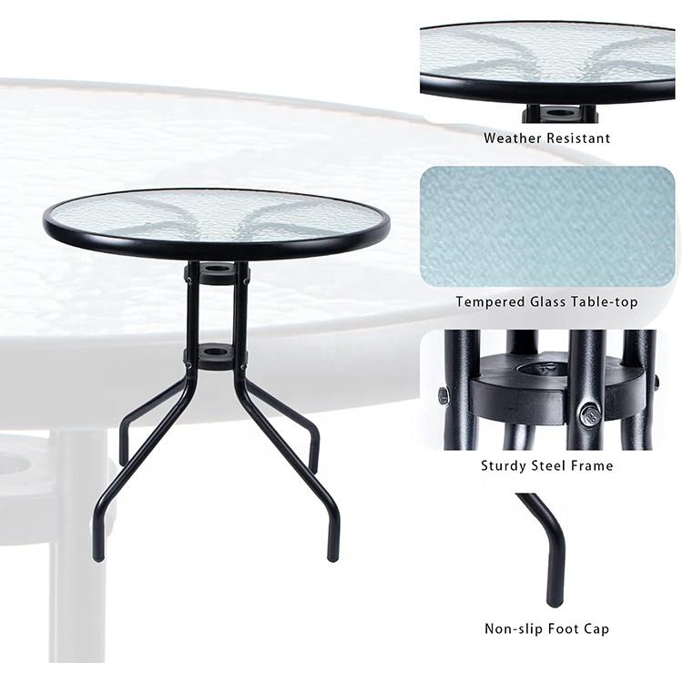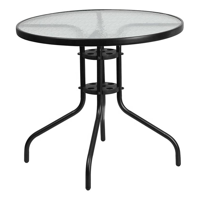 โต๊ะกระจกนิรภัยด้านข้างสำหรับร้านอาหารกลางแจ้งในเชิงพาณิชย์โครงเหล็กสีดำสำหรับลานบ้านโต๊ะรับประทานอาหารสนามหญ้าสวนสระว่ายน้ำโต๊ะปาร์ตี้