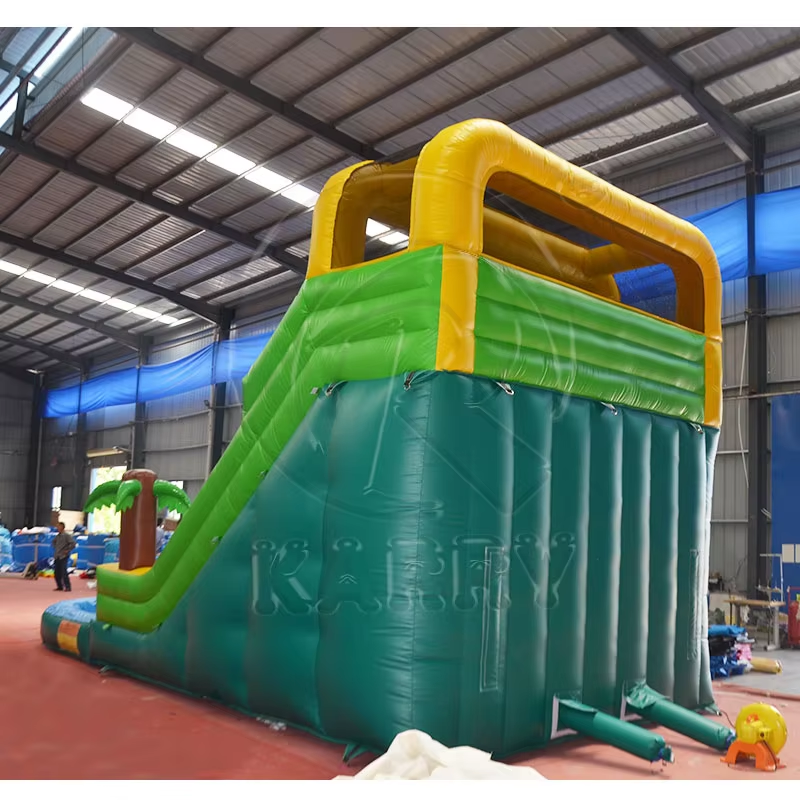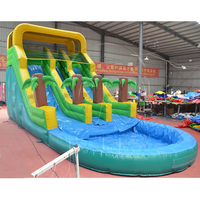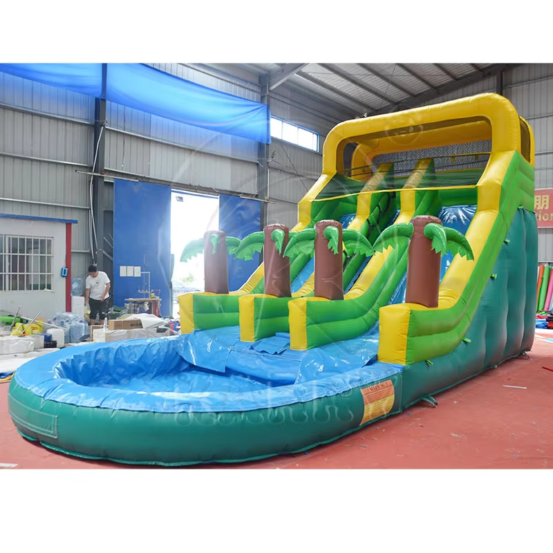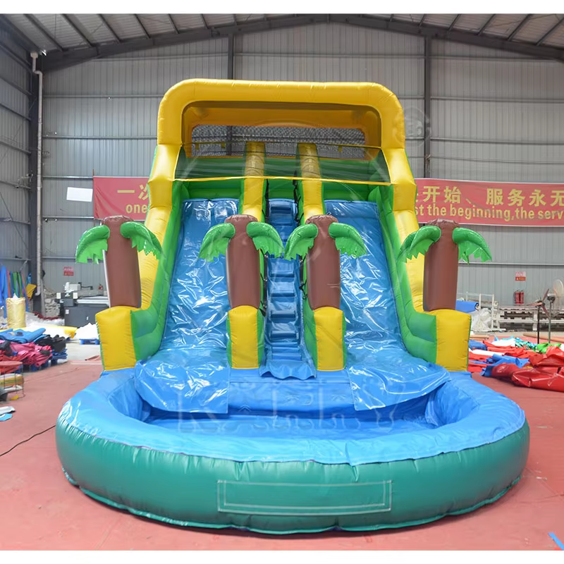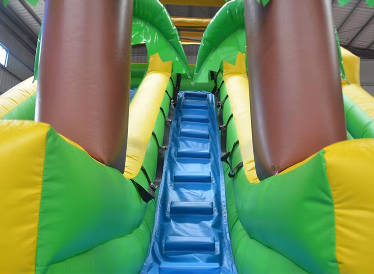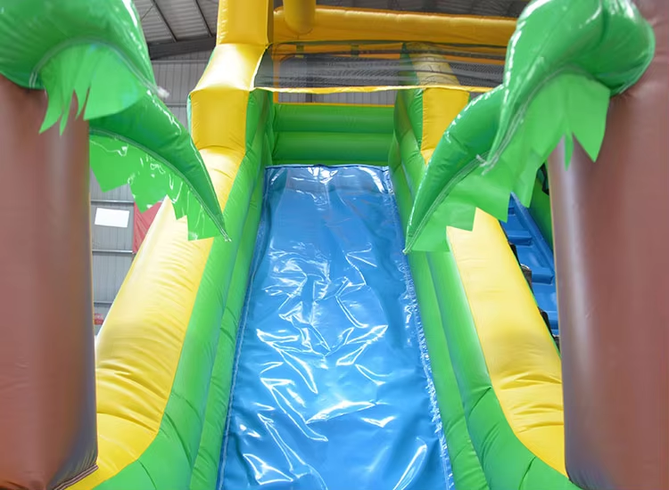 กิจกรรมกลางแจ้งเชิงพาณิชย์สำหรับเด็กและผู้ใหญ่ปราสาทเด้งดึ๋งสไลเดอร์ผ้าใบเป่าลมวัสดุพีวีซีแบบเป่าลมติดตั้งง่ายต้นปาล์มเขตร้อน