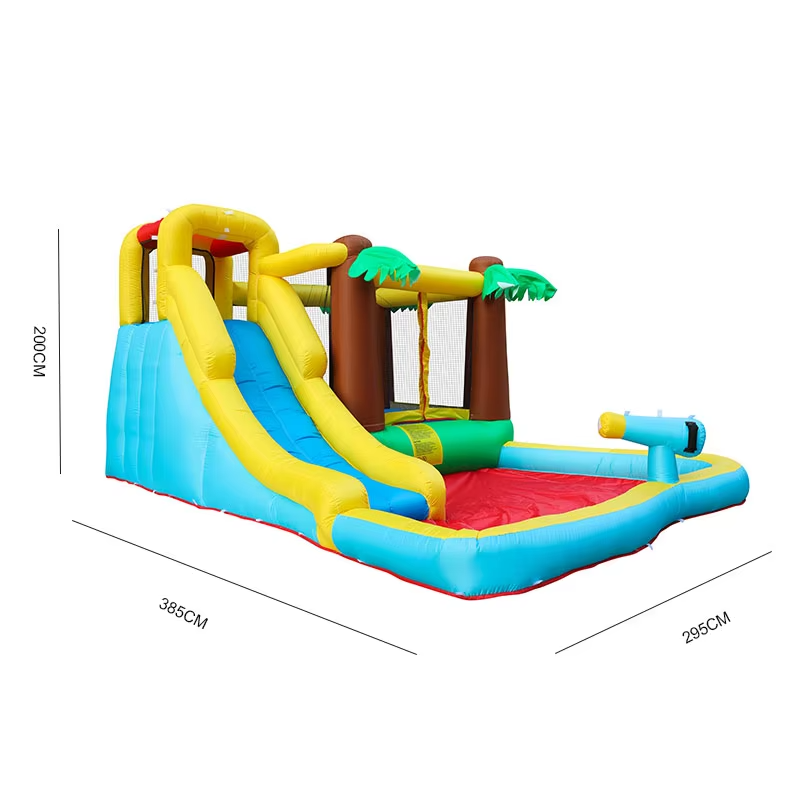 บ้านเป่าลม PVC เป่าลมกลางแจ้งใช้ในเชิงพาณิชย์บ้านเด้งสำหรับเด็กสวนผจญภัยพร้อมสระว่ายน้ำและต้นปาล์ม