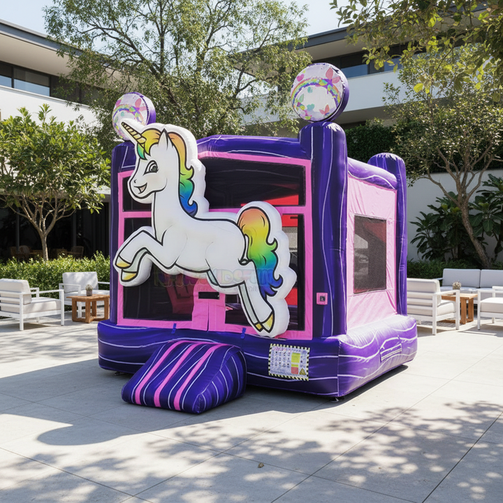 บ้านเด้งเป่าลมรูปยูนิคอร์นเชิงพาณิชย์พร้อมสไลเดอร์และสระว่ายน้ำคอมโบปราสาทสำหรับเด็กเช่า