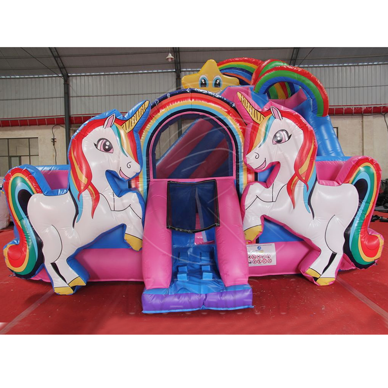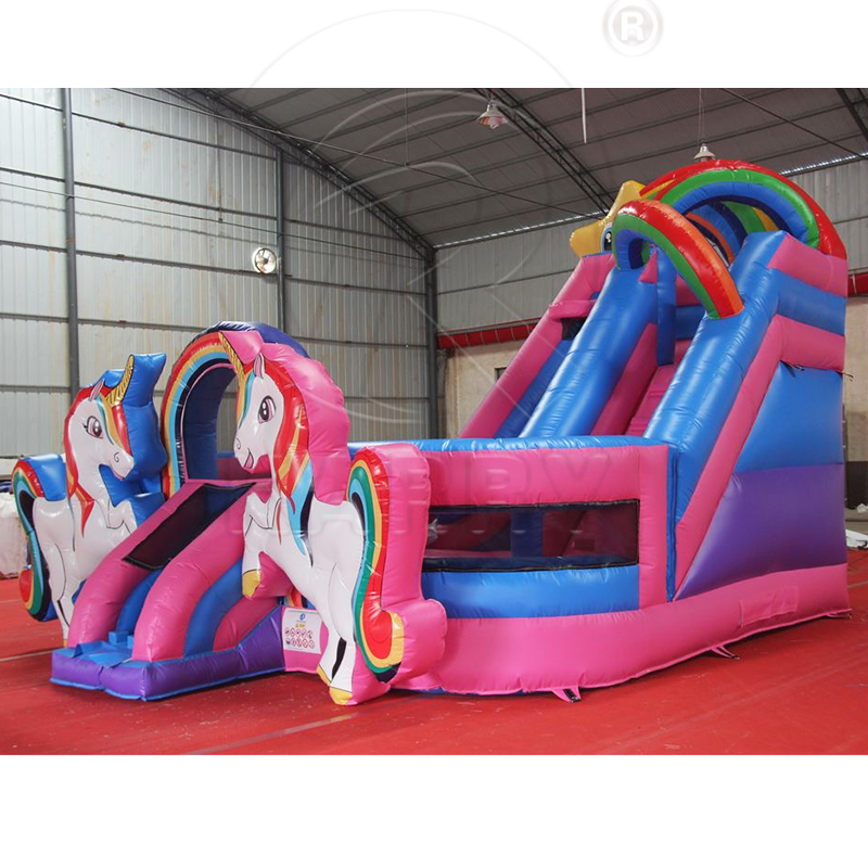 สไลเดอร์แบบกระโดดพร้อมที่เป่าลมรูปยูนิคอร์นสีรุ้งใช้ในเชิงพาณิชย์