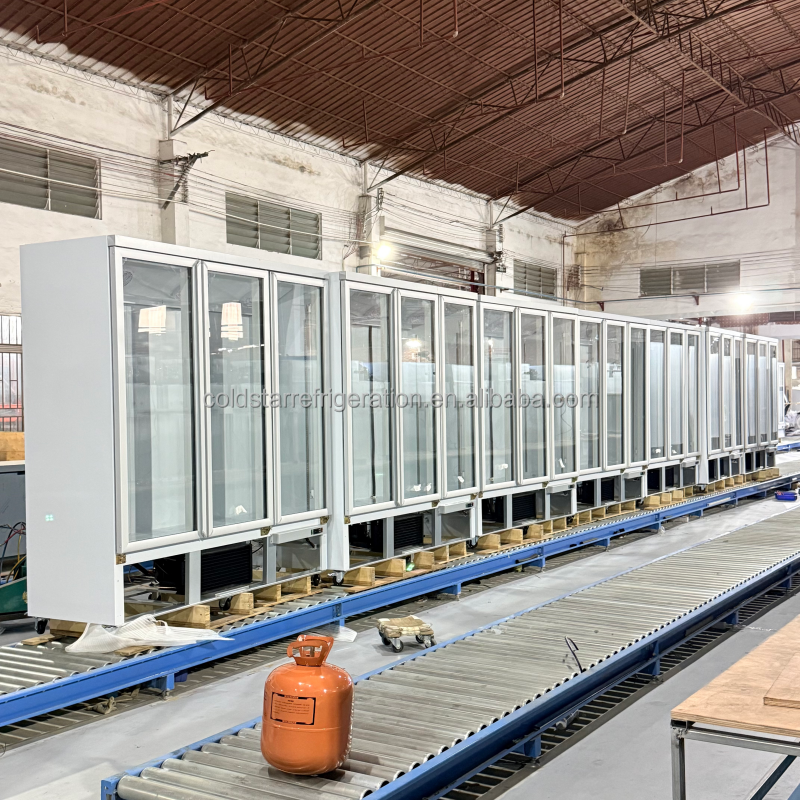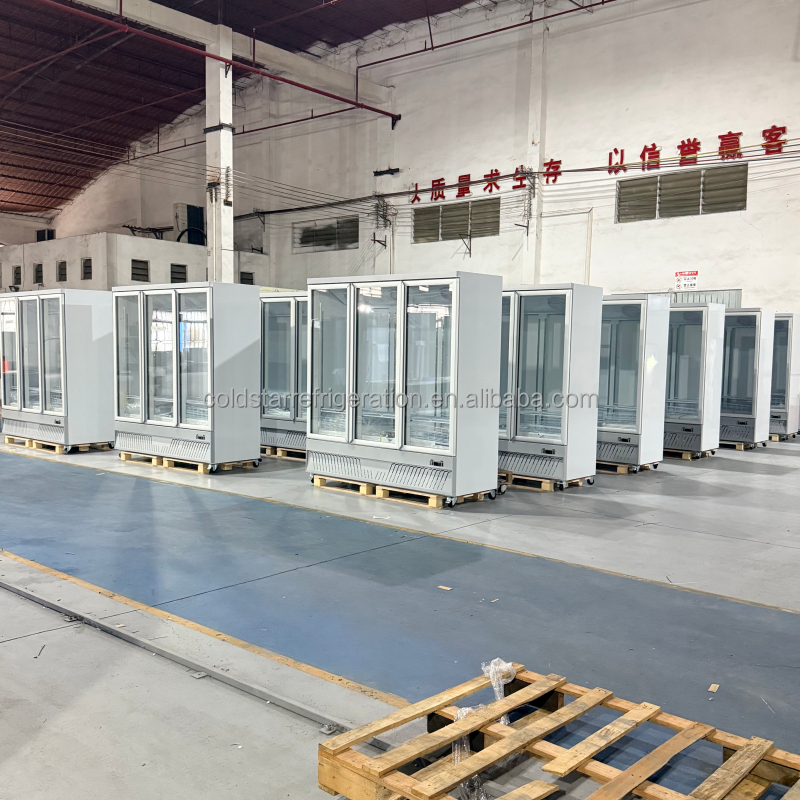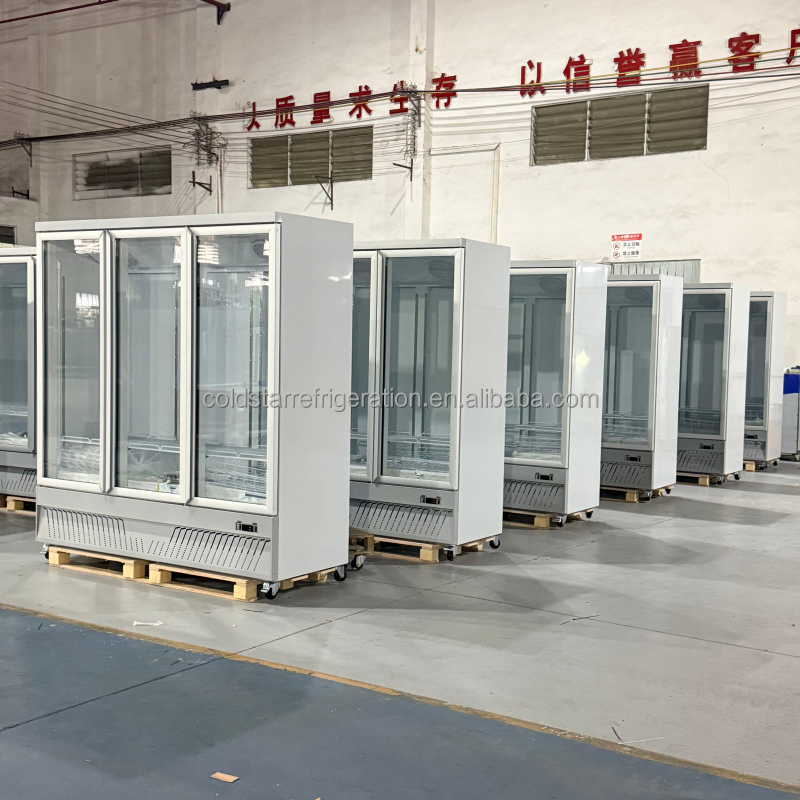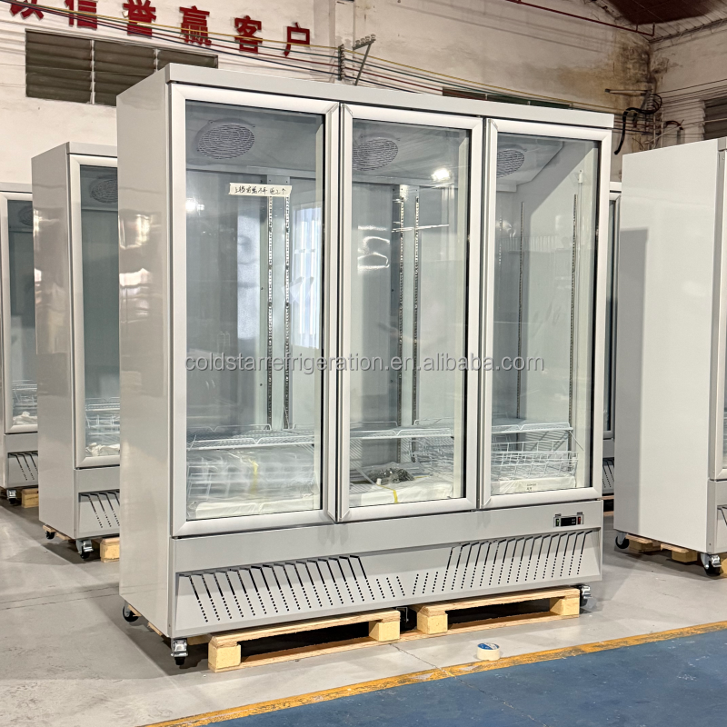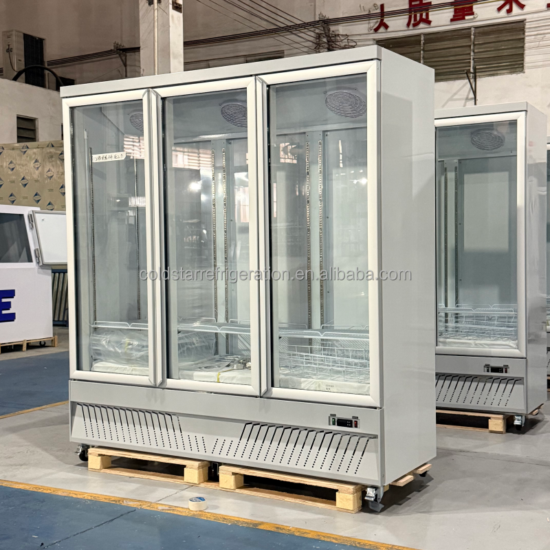 พัดลมระบายความร้อนแบบสามประตูหรูหราเชิงพาณิชย์ระบายความร้อนด้วย1800L ทำความเย็นได้โดยตรงประตูกระจกสองชั้นผักเบียร์