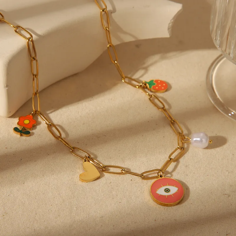 สร้อยคอจี้หัวใจรูปดาวปีศาจแดงทำจากสเตนเลส304ชุบทอง18K อุปกรณ์เสริมแฟชั่นสำหรับเดินทาง