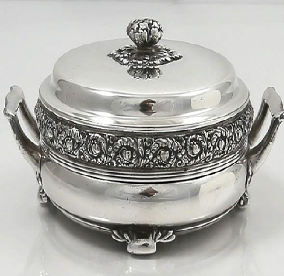 ชามซุปสีเงินขนาดกะทัดรัด พร้อมแถบลายขวางและฝาปิดลายดอกไม้ ร้านค้าจำหน่ายสินค้าในราคาขายส่ง