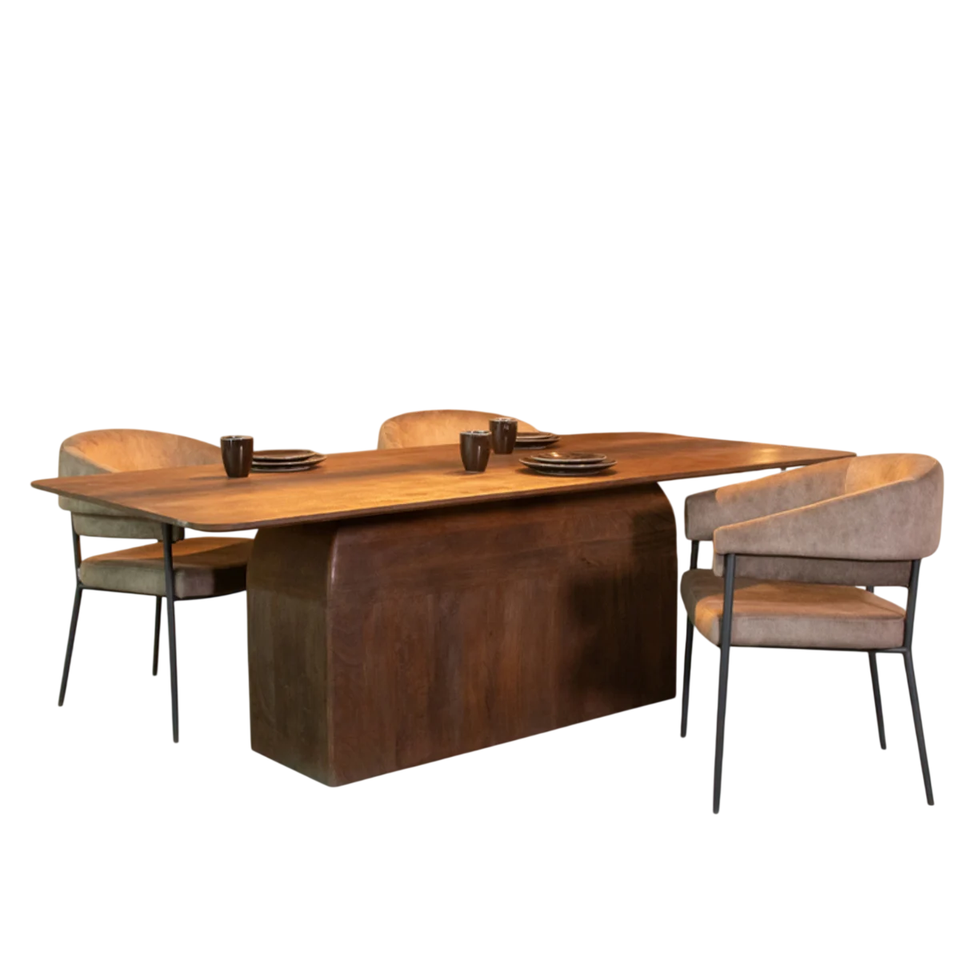 โต๊ะรับประทานอาหารไม้มะม่วงแท้ทำมือทั้งชิ้น หน้าไม้สีน้ำตาล ฐานตั้งขนาดใหญ่ สำหรับบ้านพักอาศัยหรือวิลล่า สไตล์โมเดิร์น สำหรับ 6-8 ที่นั่ง