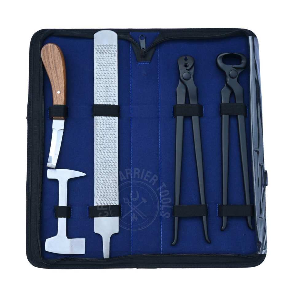 ชุดเครื่องมือดูแลกีบม้าครบชุด พร้อมมีดตัดแต่งกีบสองด้านคมกริบ คีมตัดกีบ ที่ดึงเล็บม้า ตะไบขัดกีบ และกล่องเก็บ