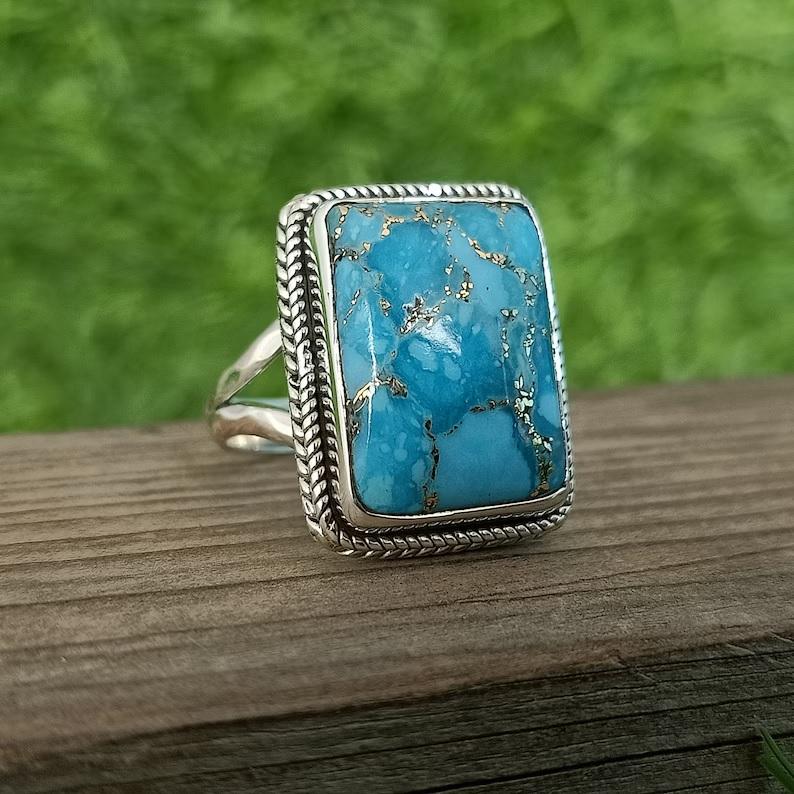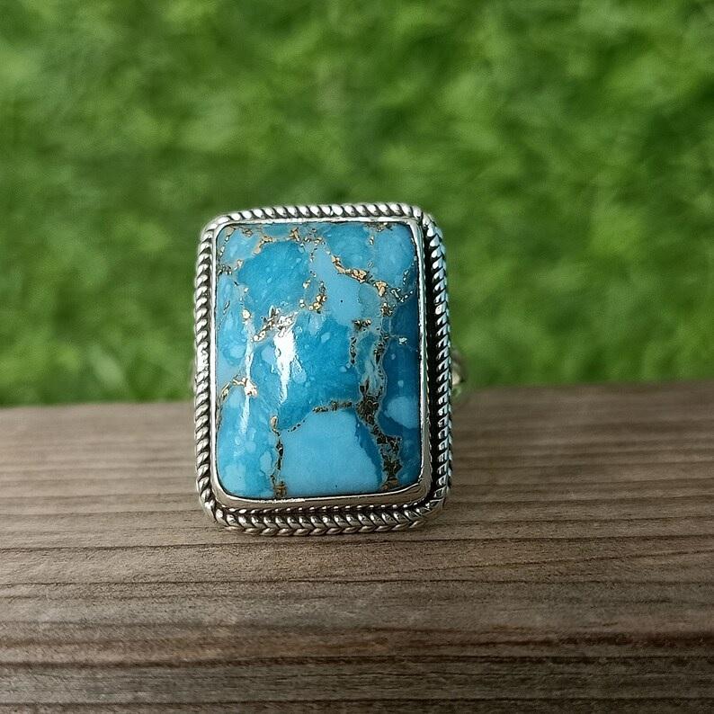 แหวนพลอยเทอร์ควอยส์โบโฮทำด้วยมือ925เป็นของขวัญเครื่องประดับโบฮีเมียนสำหรับเธอแหวนพลอยแฟชั่น