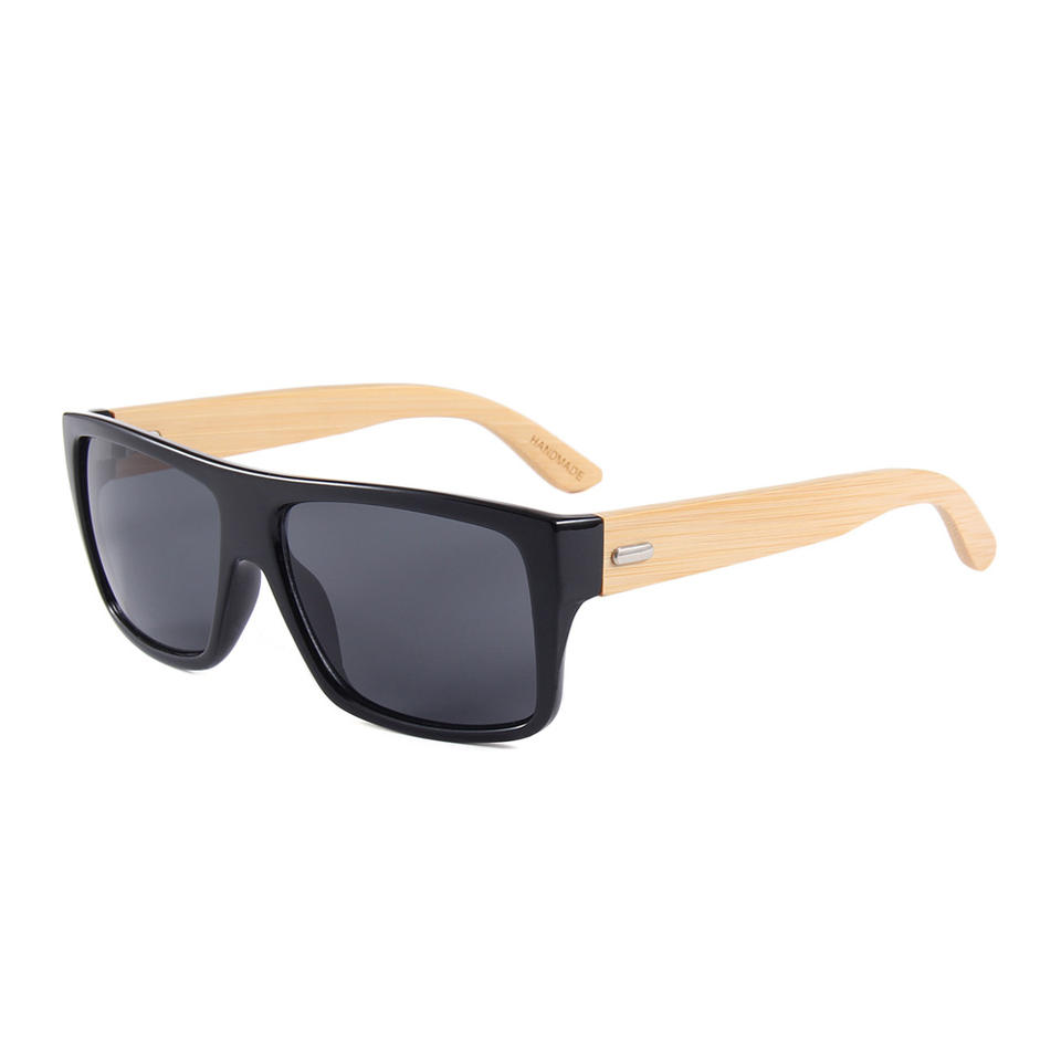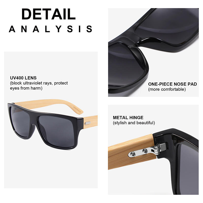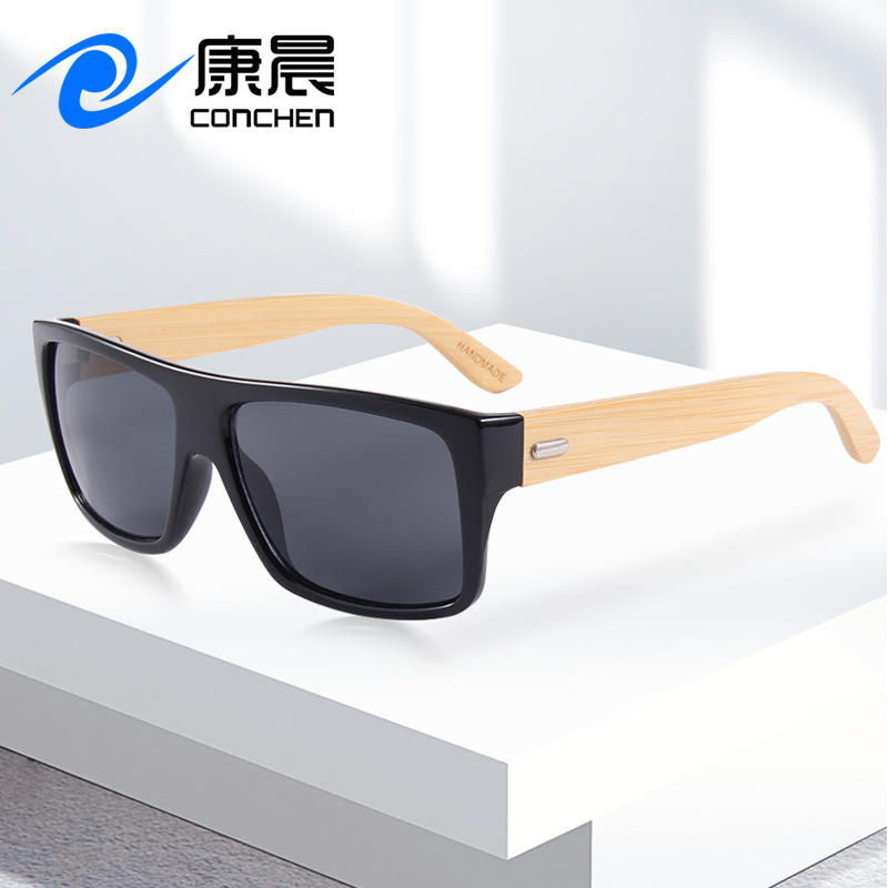 แว่นกันแดดทรงเหลี่ยมสำหรับผู้ชาย รุ่น Conchen กรอบพลาสติกสีดำ ขาแว่นไม้ไผ่ ป้องกันรังสียูวี 400 เหมาะสำหรับการเดินทางและขับรถ