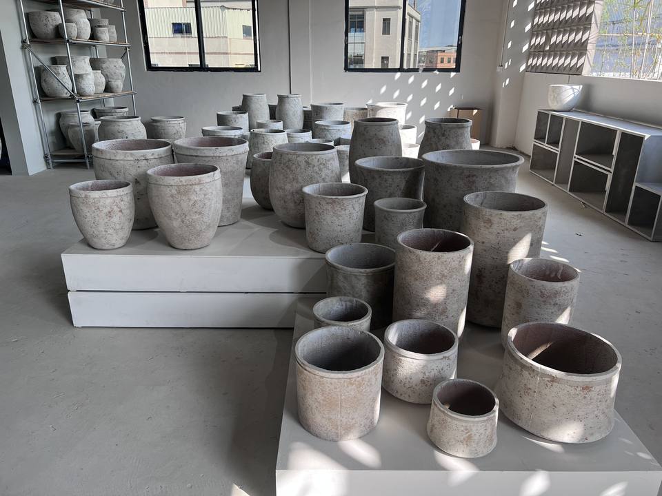 กระถางต้นไม้ไฟเบอร์กลาสคอนกรีต กระถางต้นไม้กันน้ําน้ําหนักเบาโค้งขนาดใหญ่จํานวนมาก