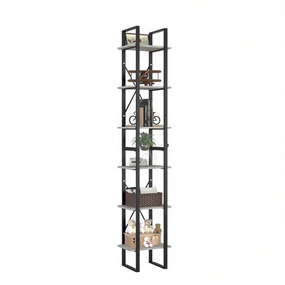 ตู้หนังสือไม้เอ็นจิเนียร์สีเทาคอนกรีต 7 ชั้น ชั้นวางของแบบประหยัดพื้นที่ เฟอร์นิเจอร์ห้องนั่งเล่นแบบตั้งพื้น