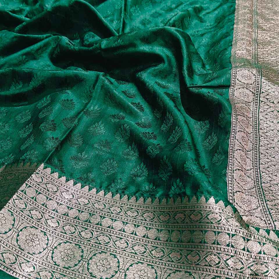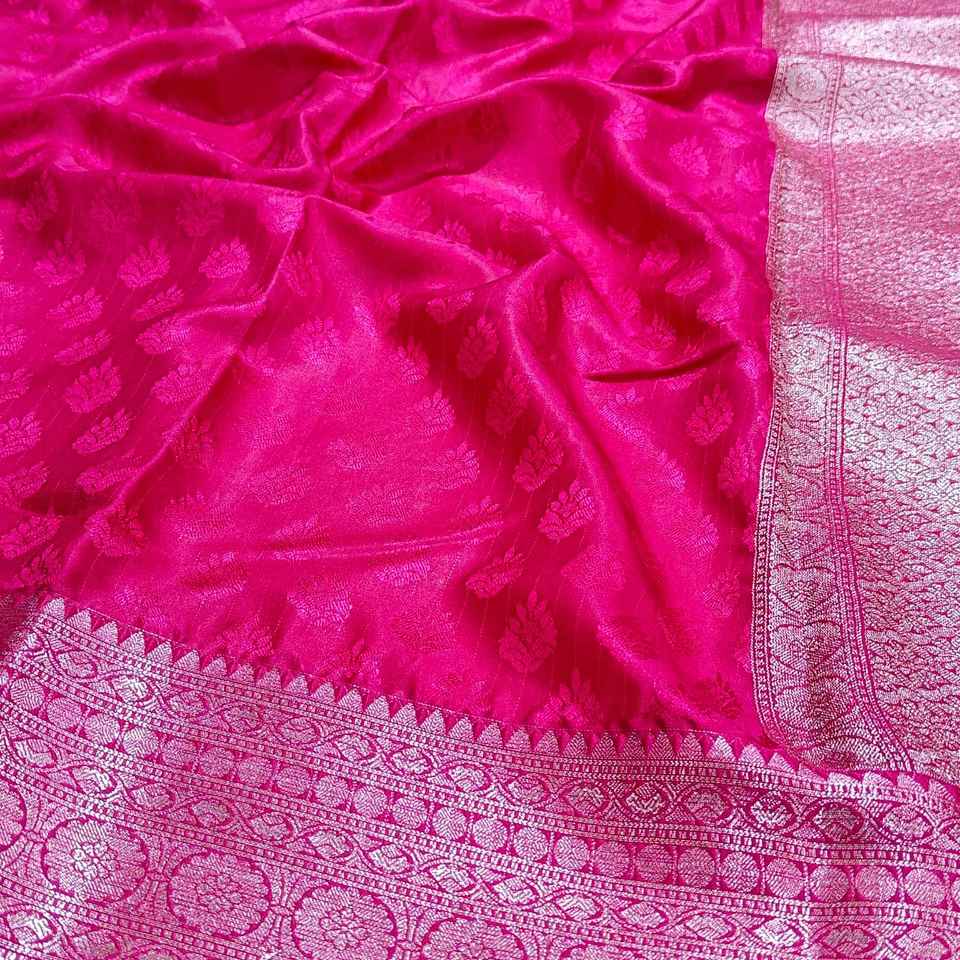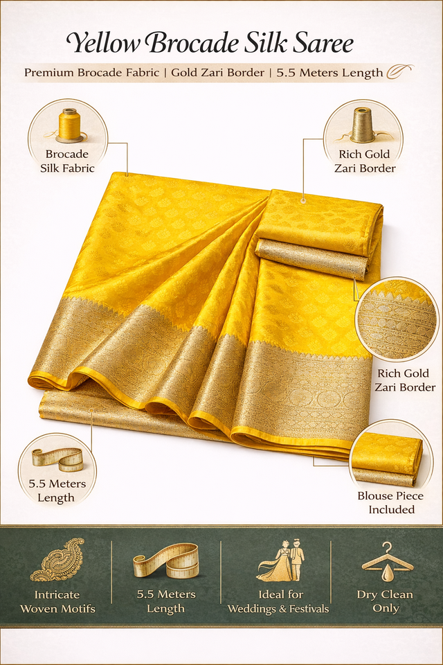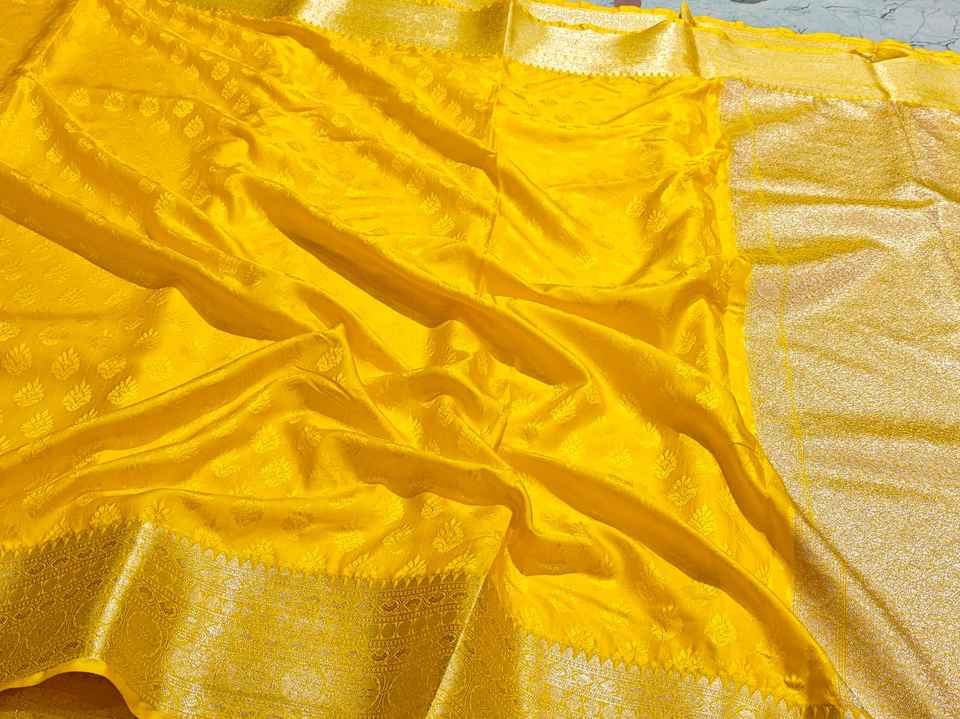 ผ้าไหมลายดอกไม้สีเหลืองแบบโคนิเฟอร์ พร้อมขอบผ้าปักดิ้นทองอย่างดี ผ้าส่าหรีอินเดียแบบดั้งเดิมสำหรับงานแต่งงานและงานเฉลิมฉลอง มีสินค้าพร้อมส่ง