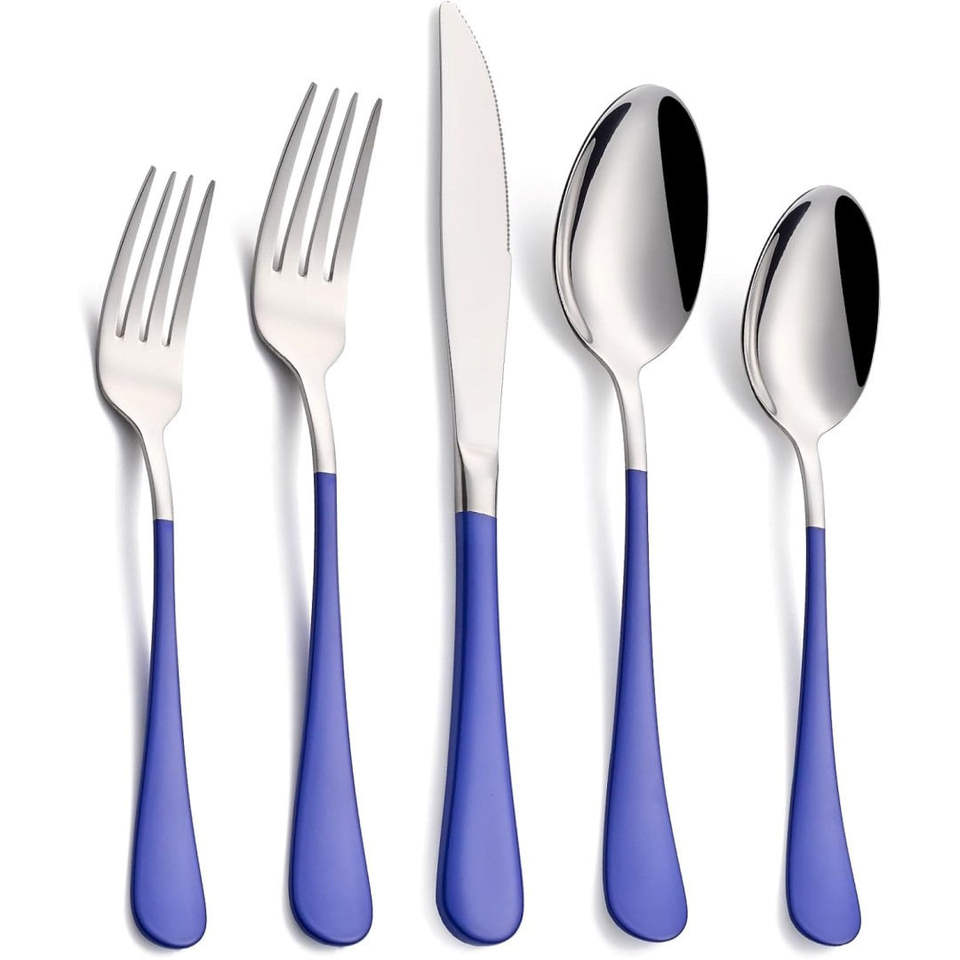 ชุดเครื่องใช้บนโต๊ะอาหารสแตนเลสชุบเงิน5ชิ้นสไตล์อเมริกันร่วมสมัยมีด้ามจับสีฟ้าหรูหรา
