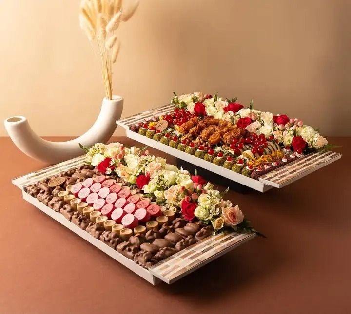ถาดเสิร์ฟโค้งสีดำและสีเงินสไตล์ร่วมสมัย พร้อมช็อกโกแลตห่อสีแดงและสีขาว ของขวัญและของใช้ในงานปาร์ตี้ที่ทันสมัยและมีสไตล์