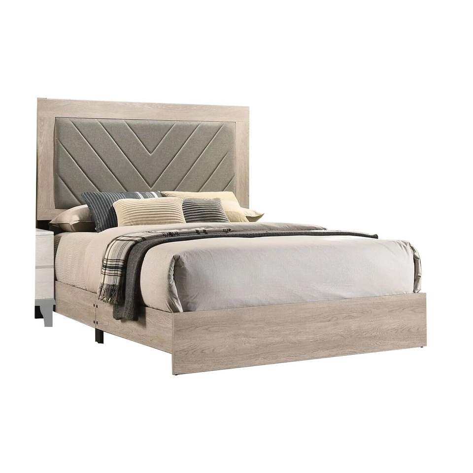 เตียงควีนไซส์สีครีมสไตล์ร่วมสมัยพร้อมหัวเตียงดีไซน์รูปตัววีสีเทา 1 ชิ้น โครงเตียงทำจากไม้ยางพาราหุ้มเบาะ เฟอร์นิเจอร์ห้องนอน