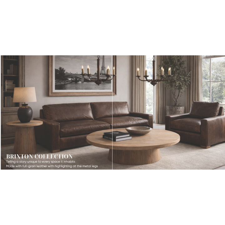 โซฟาหนังสีน้ำตาลเข้มสไตล์ร่วมสมัยขนาดใหญ่ 2 ที่นั่ง 3 ที่นั่ง พร้อมดีไซน์ที่วางแขนทรงเหลี่ยม เฟอร์นิเจอร์ห้องนั่งเล่นทันสมัย