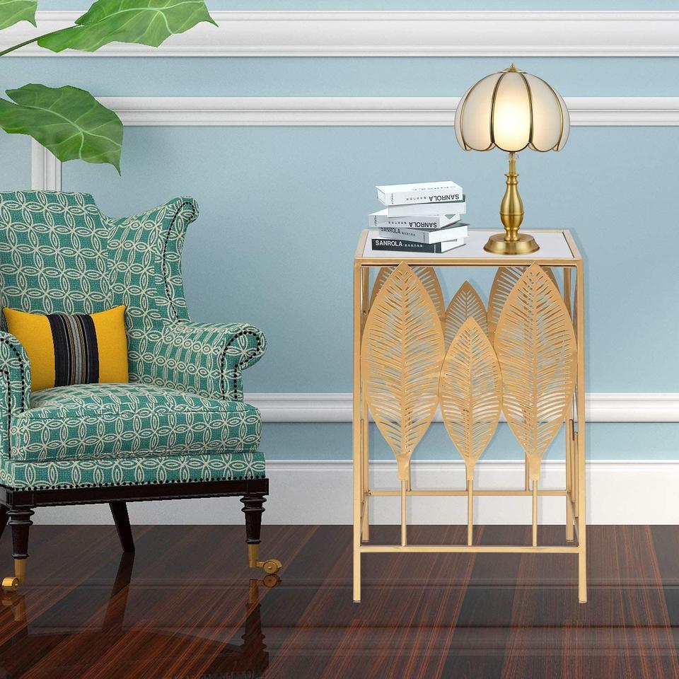 การออกแบบใบไม้ตกแต่งร่วมสมัยโต๊ะข้างเหล็กสำเร็จรูปสีทองพร้อมกระจกด้านบนใช้สำหรับตกแต่งภายในห้องนั่งเล่น
