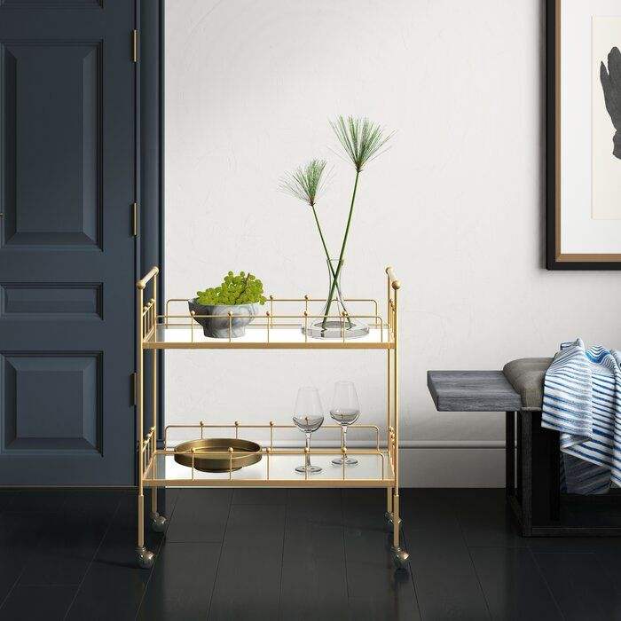 รถเข็นเหล็กดัดสไตล์ร่วมสมัยสีทอง พร้อมชั้นวางกระจกนิรภัย รถเข็นเสิร์ฟแบบมีล้อ สำหรับใช้ในบ้าน ห้องครัว ห้องรับประทานอาหาร และจัดแสดงเครื่องดื่ม