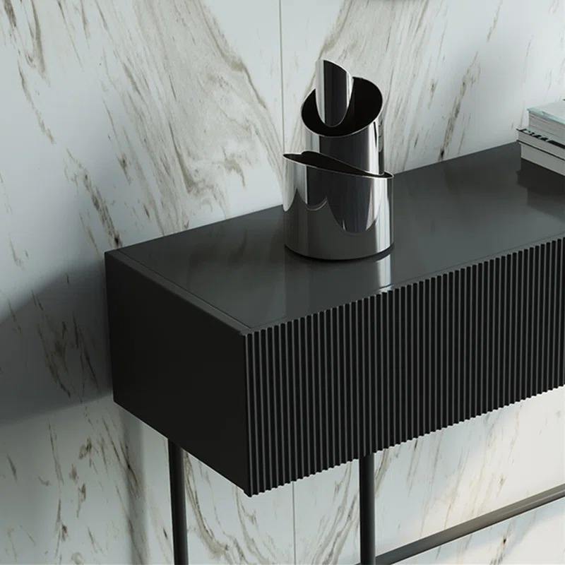 โต๊ะทำงานอเนกประสงค์เหล็กดัดลายริ้วสไตล์โมเดิร์น พร้อมตู้เก็บของแบบมินิมอล ดีไซน์แผ่นไม้แนวตั้ง เหมาะสำหรับทางเข้าบ้านและโรงแรม