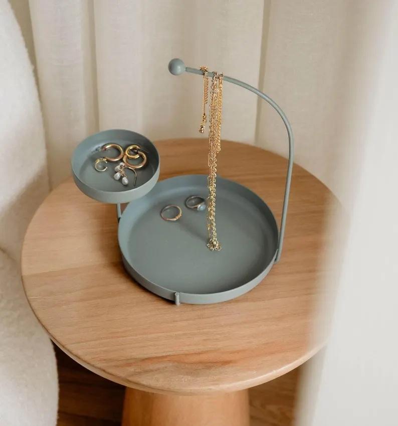 ที่วางเครื่องประดับแบบร่วมสมัยพร้อมที่วางจานยกสูง ตะขอแขวนแบบโค้ง ที่เก็บสร้อยคอ ถาดคู่ ชั้นวางอัจฉริยะสำหรับโต๊ะเครื่องแป้ง