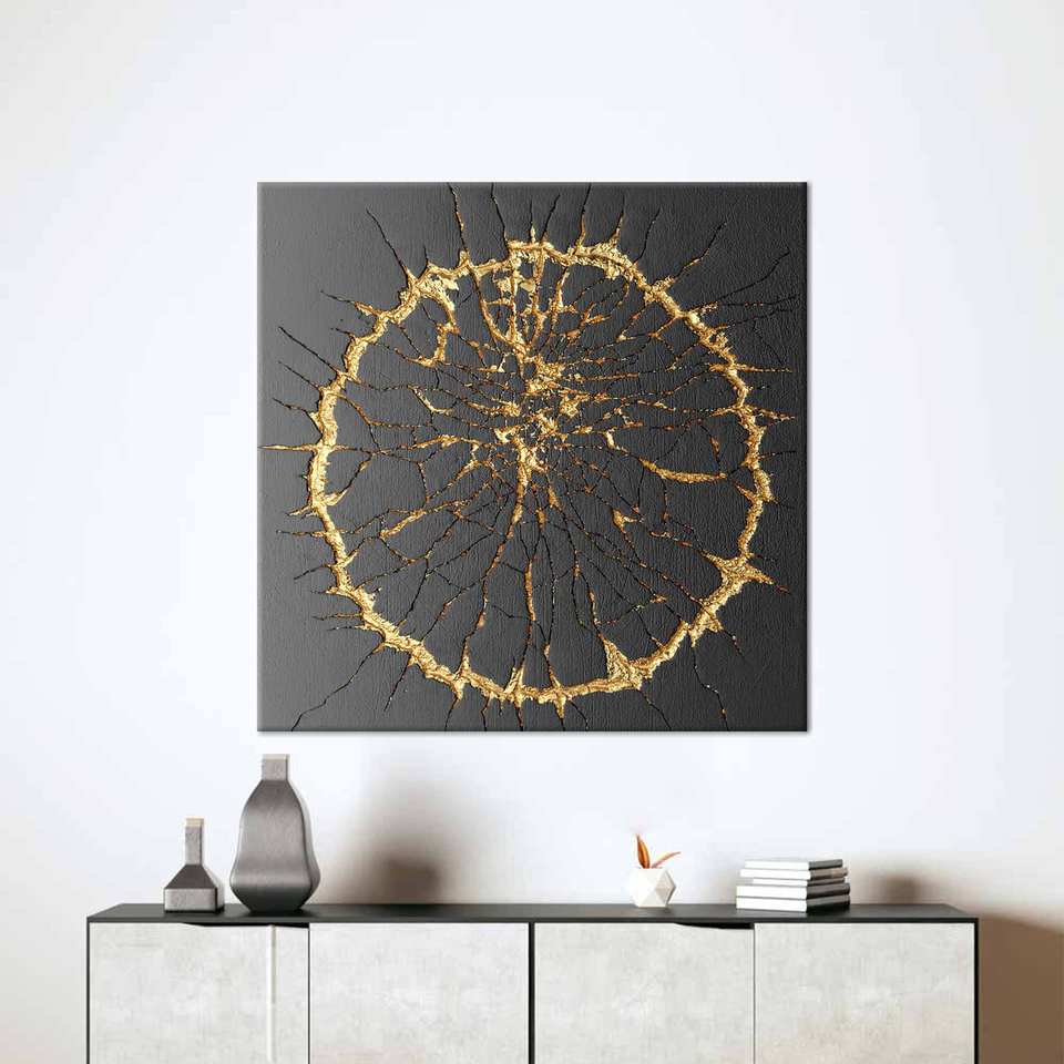 งานศิลปะติดผนัง 3 มิติ คินสึกิ สมัยใหม่ ภาพพิมพ์สีดำและสีทองแบบนามธรรมสุดหรู พร้อมกรอบสำหรับติดตั้งในแกลเลอรี