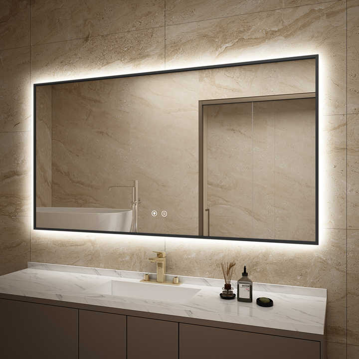 กระจกห้องน้ำมีไฟ LED กรอบสีดำทรงสี่เหลี่ยมผืนผ้ากระจกสามสีร่วมสมัย