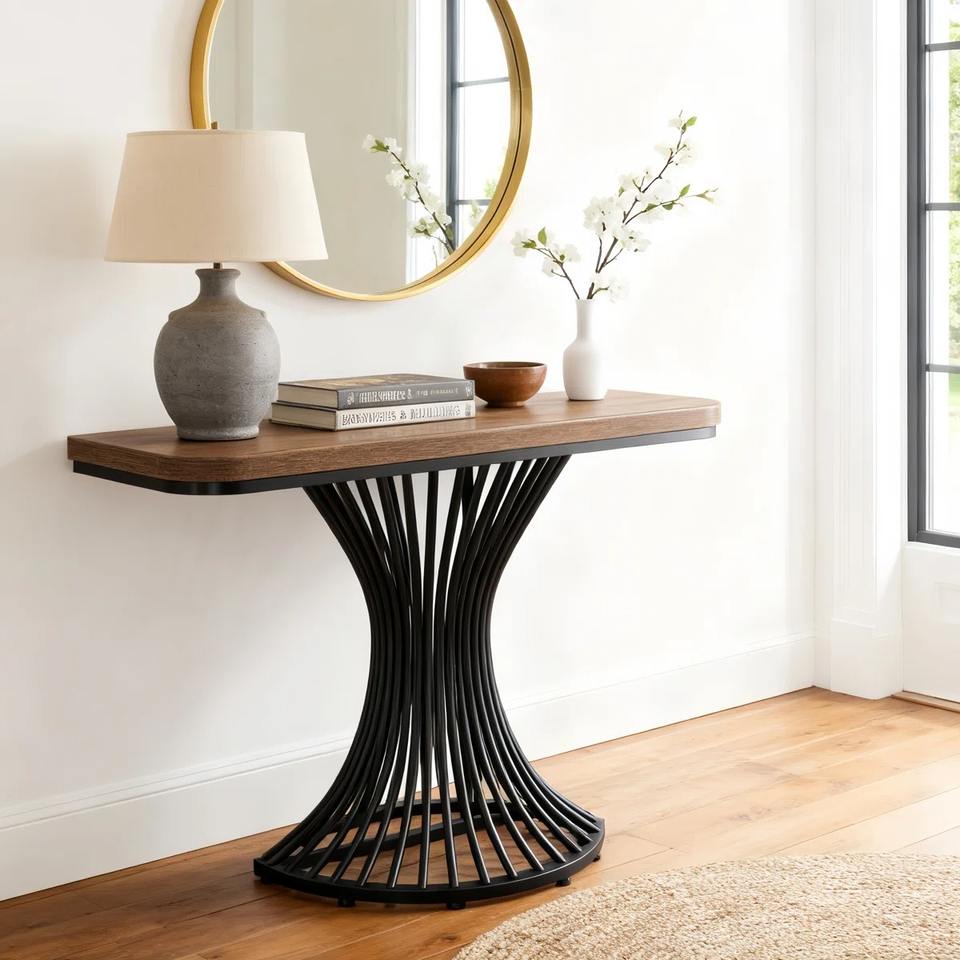 โต๊ะคอนโซลเหล็กดีไซน์ทันสมัยพร้อมฐานโค้งและไฟ LED ขอบมน พร้อมที่เก็บของ ประกอบง่ายสำหรับห้องนั่งเล่น