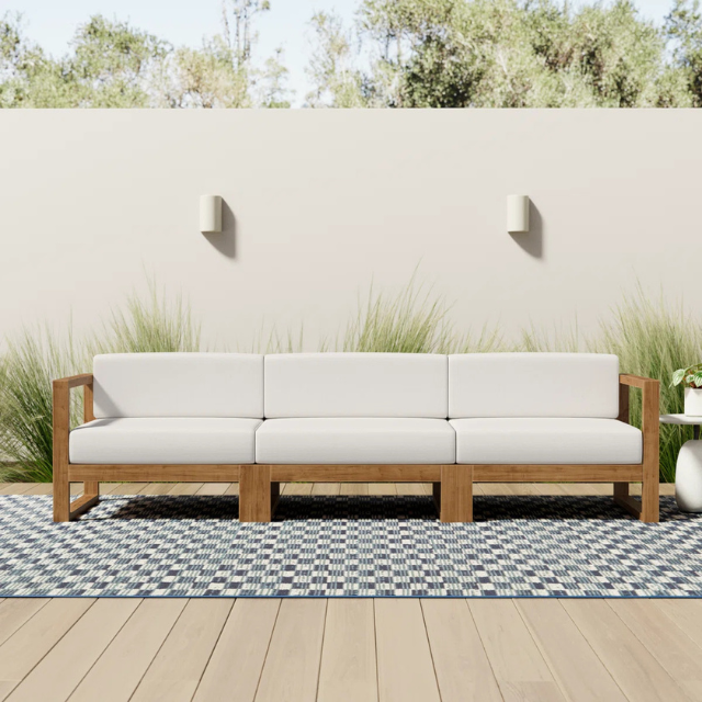 ไม้สักร่วมสมัยสามที่นั่งที่เป็นมิตรกับสิ่งแวดล้อมโซฟากลางแจ้งกันน้ำที่มีกรอบเรียบง่ายสำหรับโรงแรมและอพาร์ตเมนต์