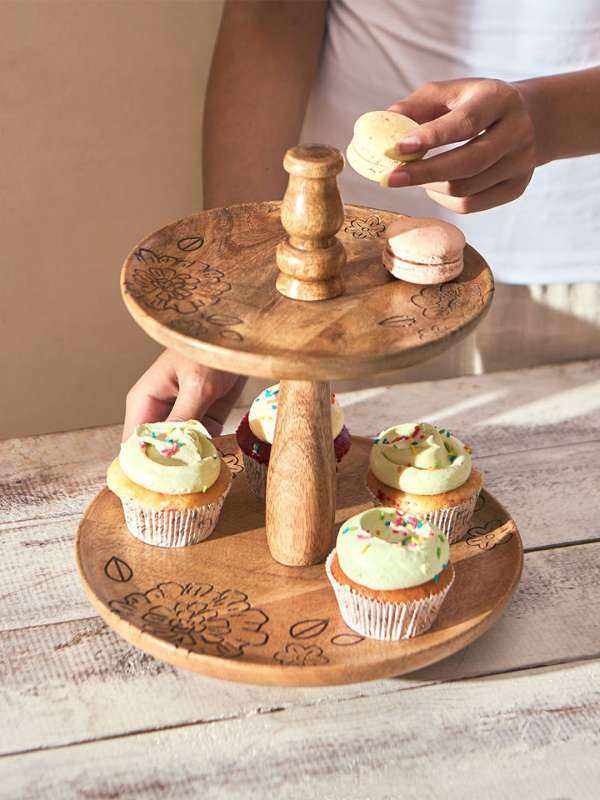 แท่นวางเค้กไม้สองระดับร่วมสมัยสำหรับงานนำเสนอที่มีสไตล์