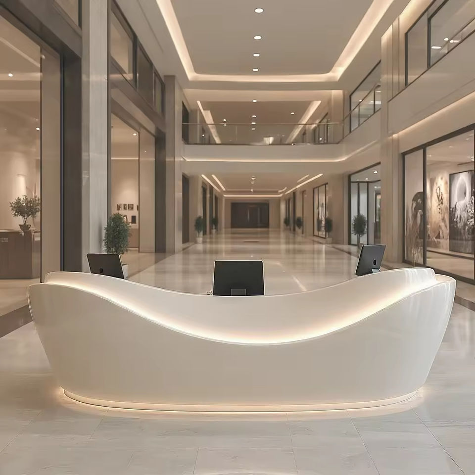 เคาน์เตอร์บาร์รับรองแขกสีขาวร่วมสมัย ดีไซน์รูปทรงคลื่น สวยงามหรูหราสำหรับพื้นที่ระดับพรีเมียม