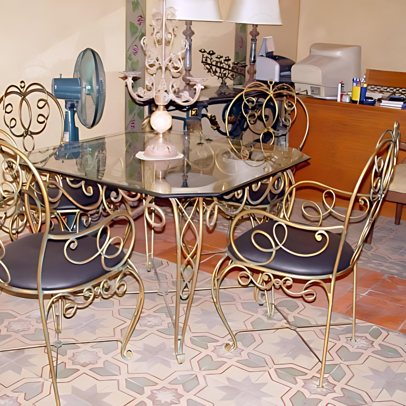 โต๊ะและเก้าอี้กลางแจ้งทำจากเหล็กแบบร่วมสมัยพร้อมม้านั่งในลานบ้านที่หรูหราสำหรับใช้ในสวนหลังบ้าน