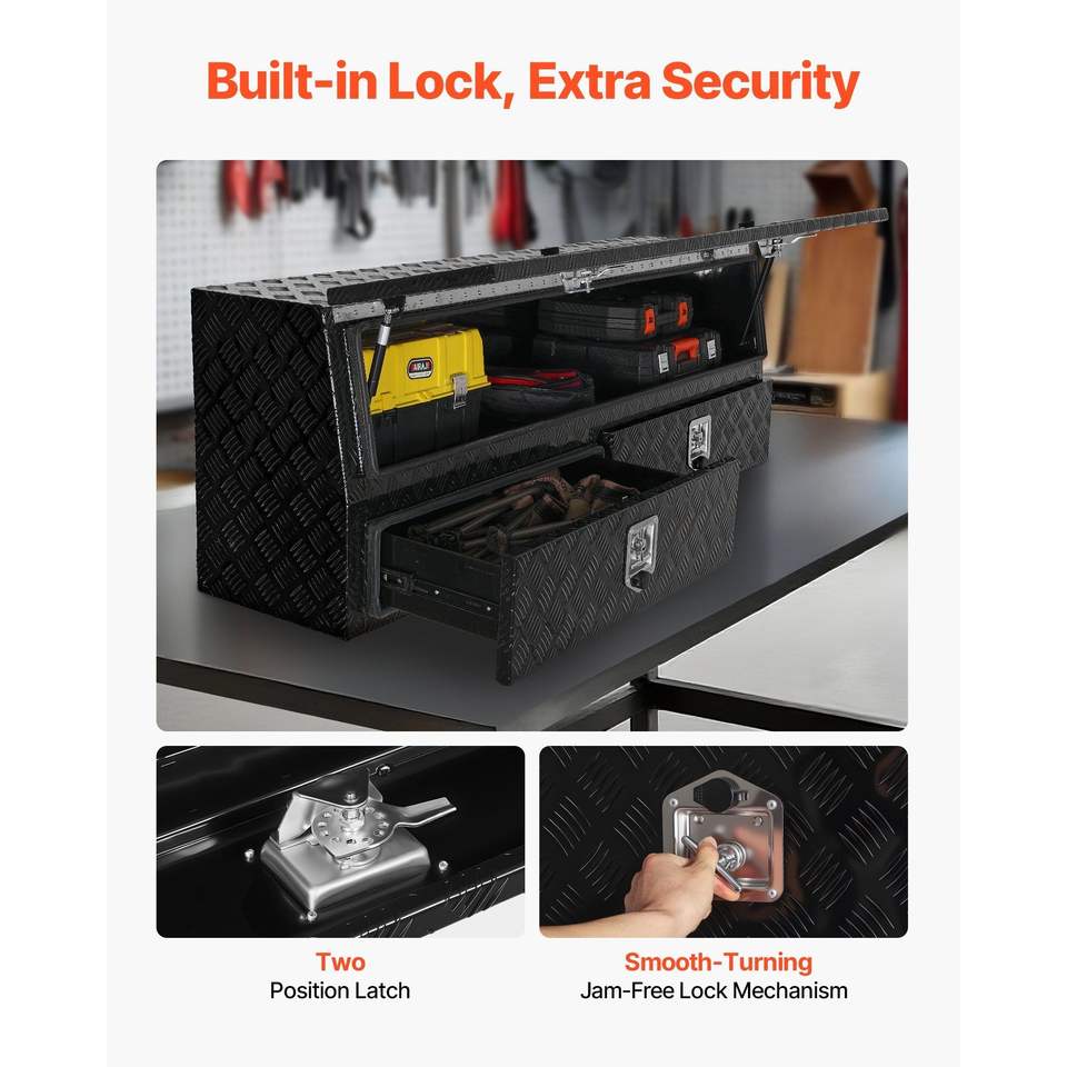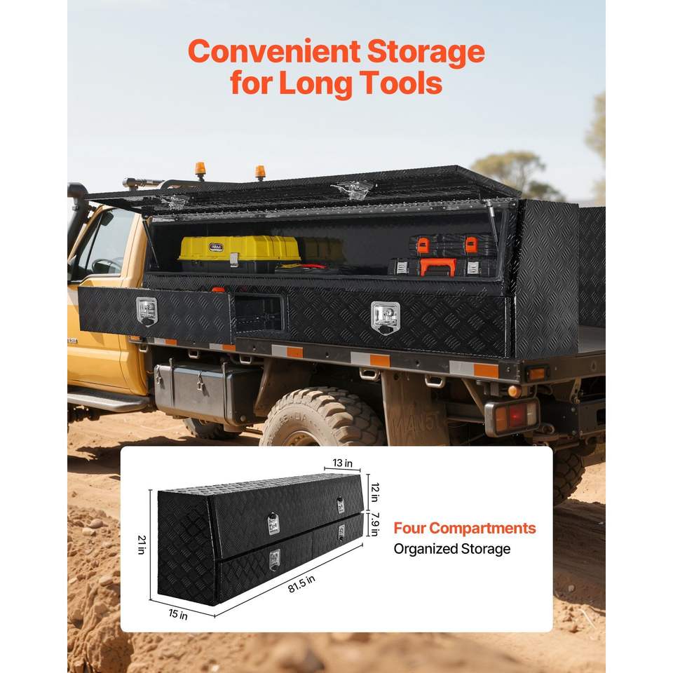 กล่องเครื่องมือสำหรับรถบรรทุกแบบมีฝาพับ ขนาด 81.5 x 21 x 13 นิ้ว สีดำ ทำจากอะลูมิเนียม TopSider พร้อมลิ้นชักสองชั้นด้านล่าง