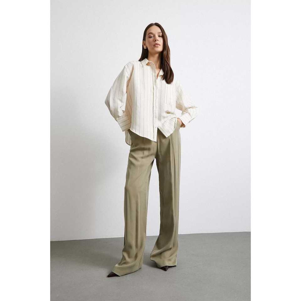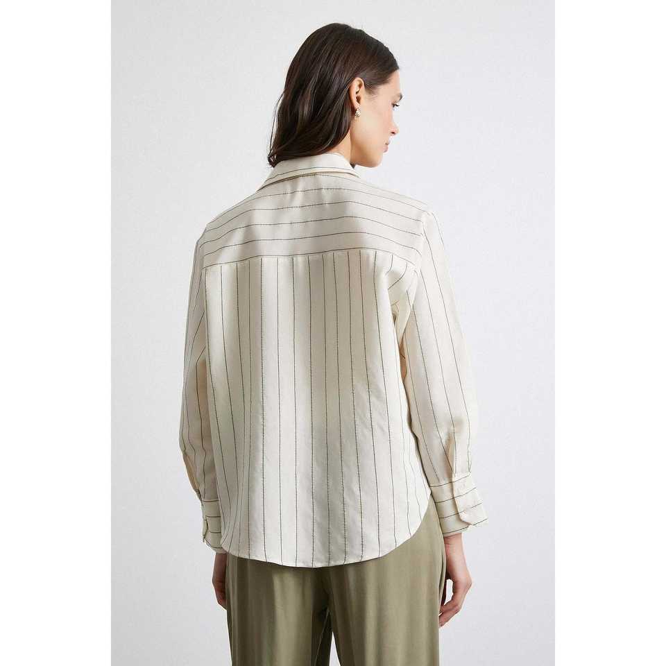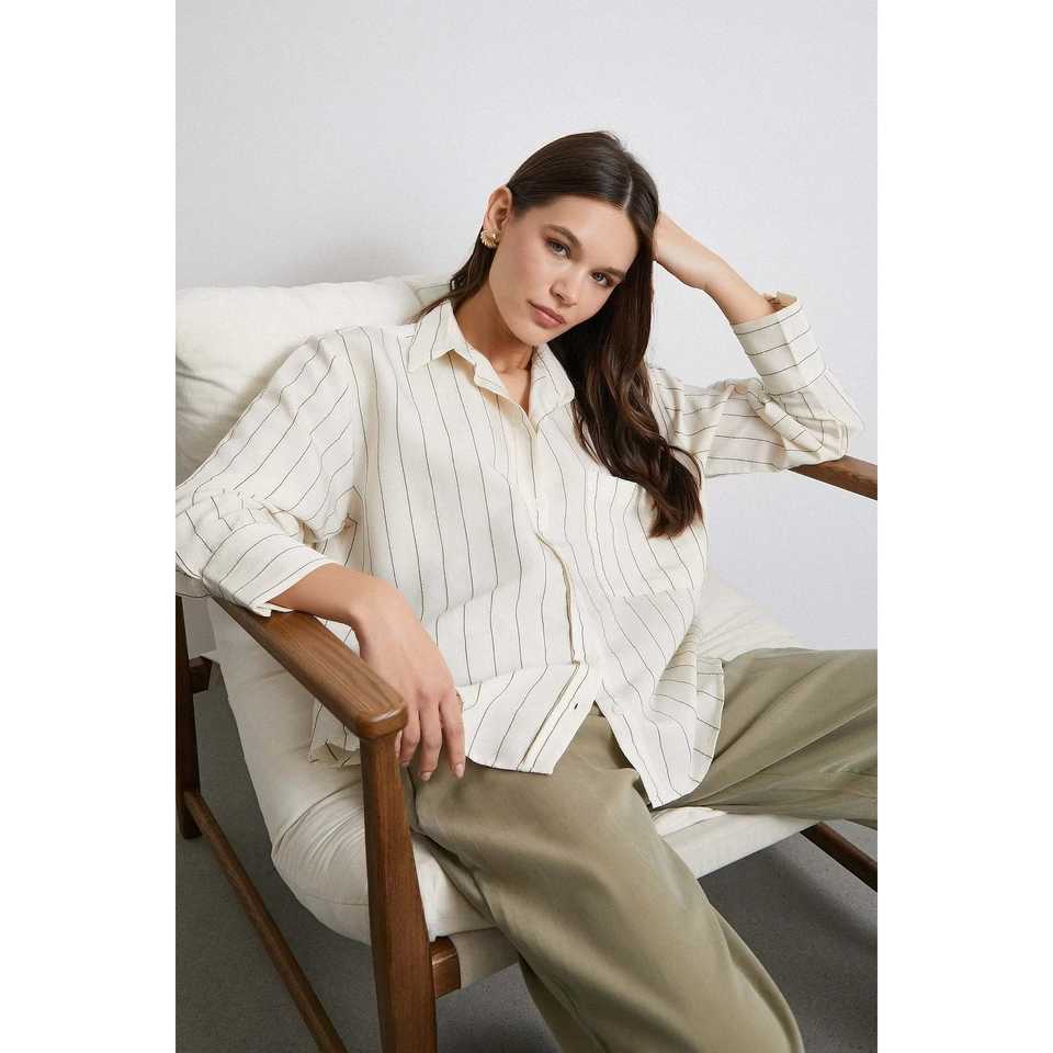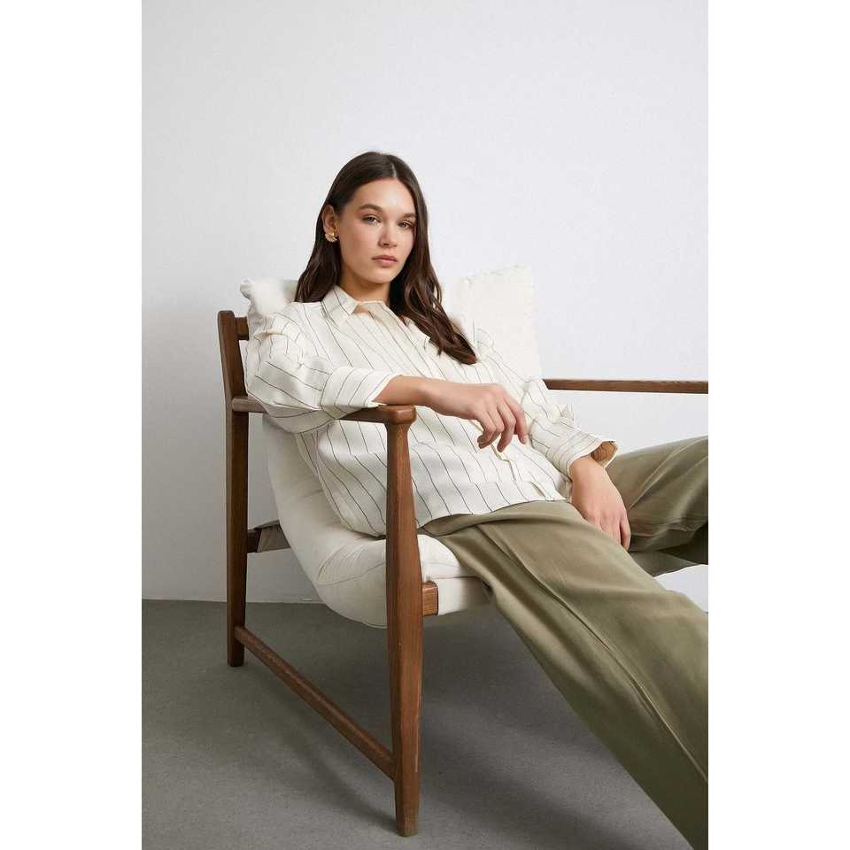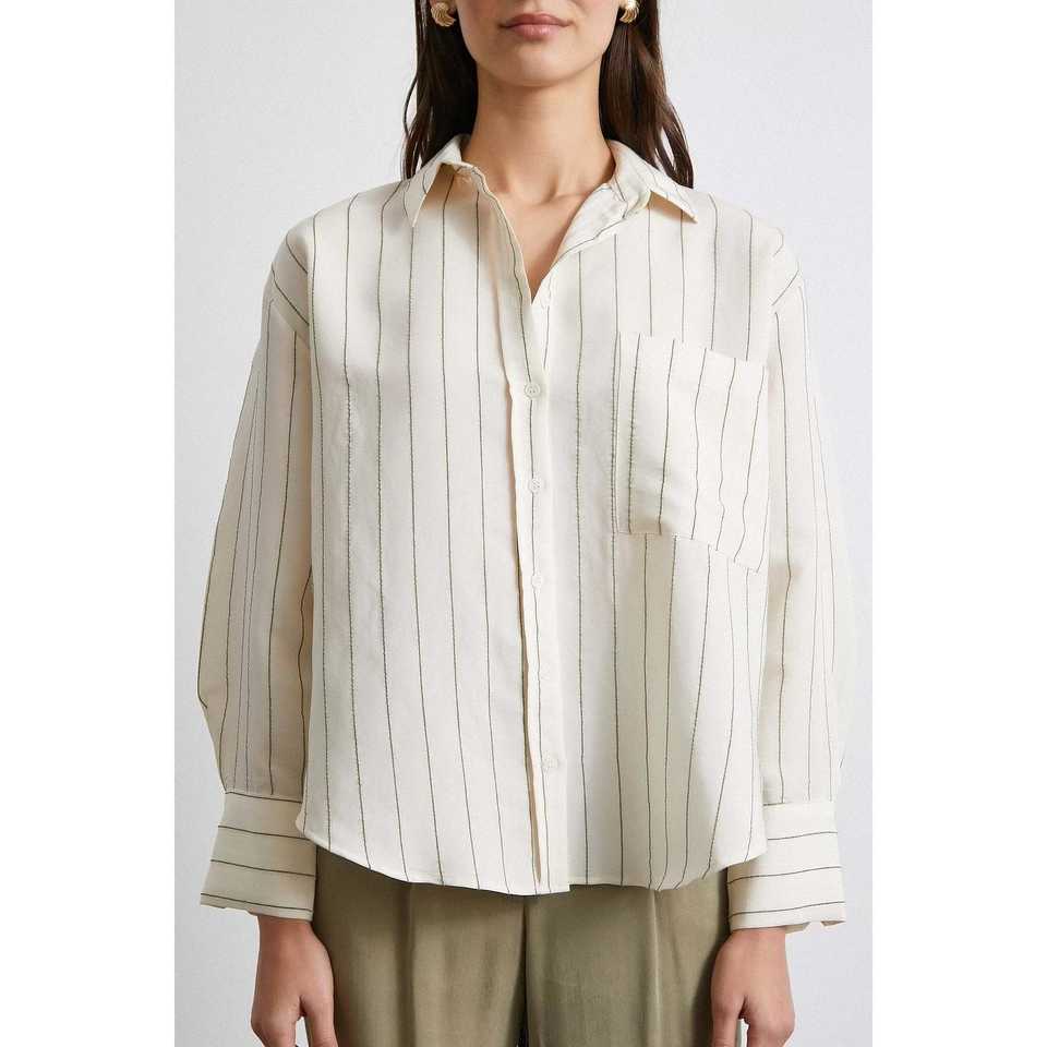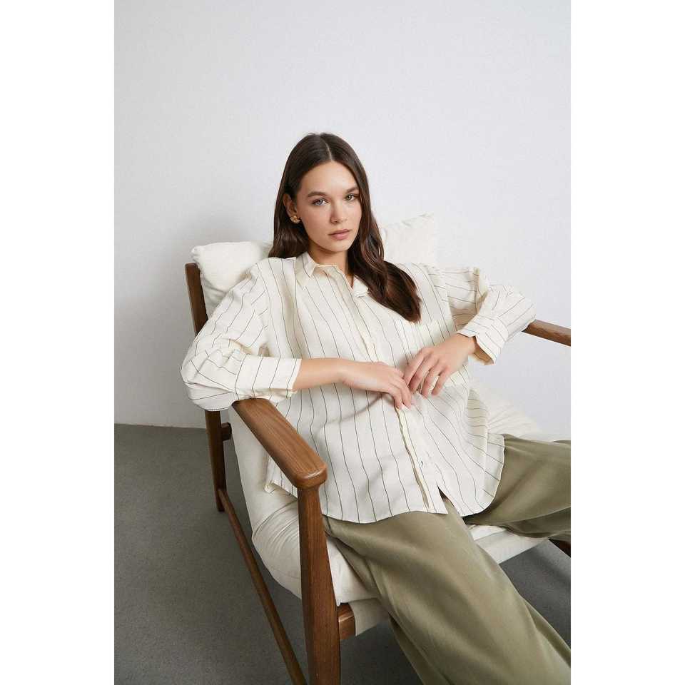 เสื้อเชิ้ตผ้าโมดอลลายทางตัดกัน เสื้อเชิ้ตผู้หญิงติดกระดุม ผ้าป๊อปลินลำลองสำหรับทุกวัน สีกากี