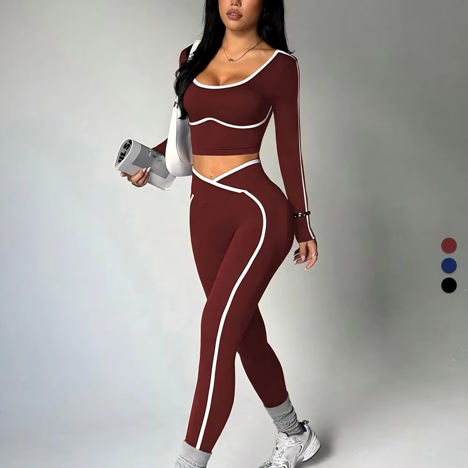 ชุดโยคะเสื้อและกางเกงสีตัดกัน ชุดออกกำลังกายแขนยาวระบายอากาศ เอวสูง ยกกระชับสะโพก ชุด 2 ชิ้นสำหรับผู้หญิง