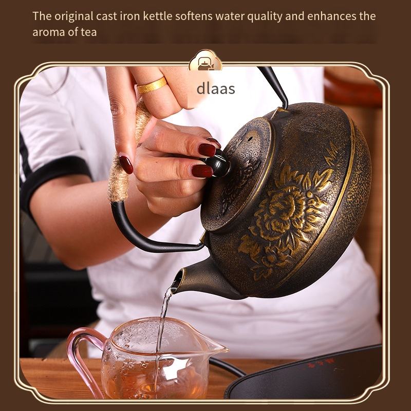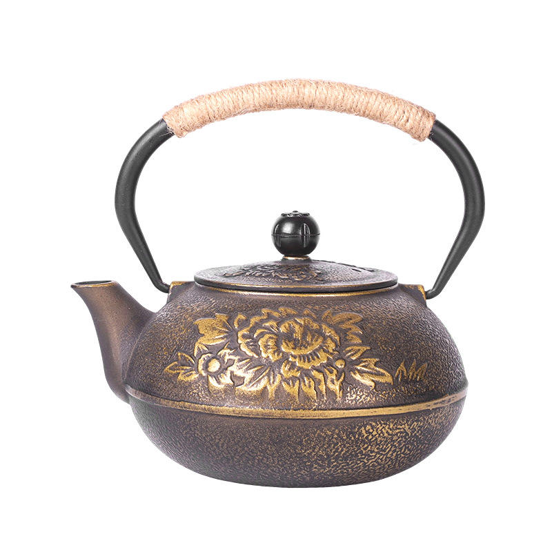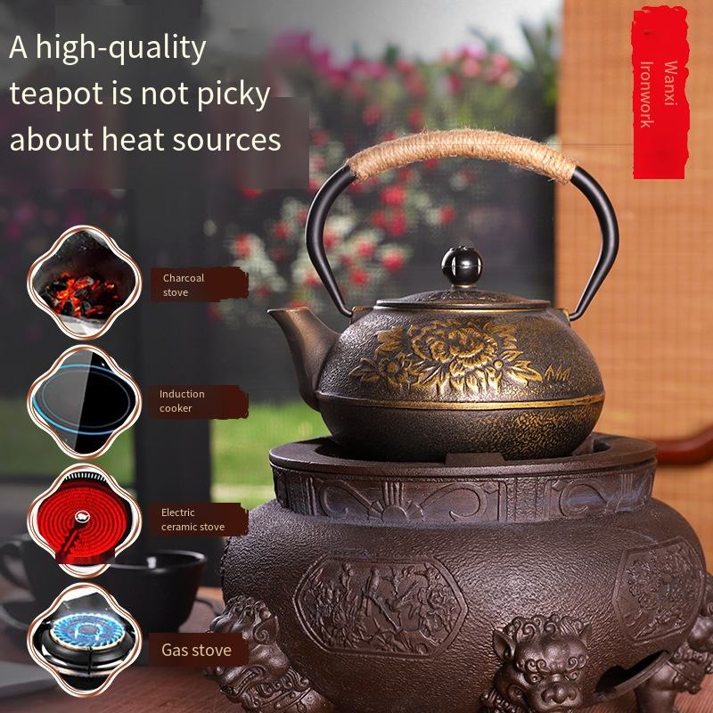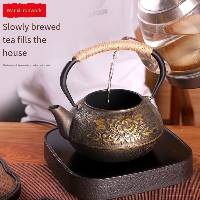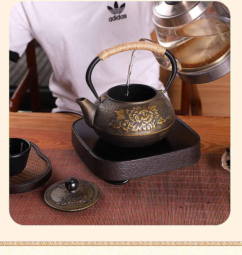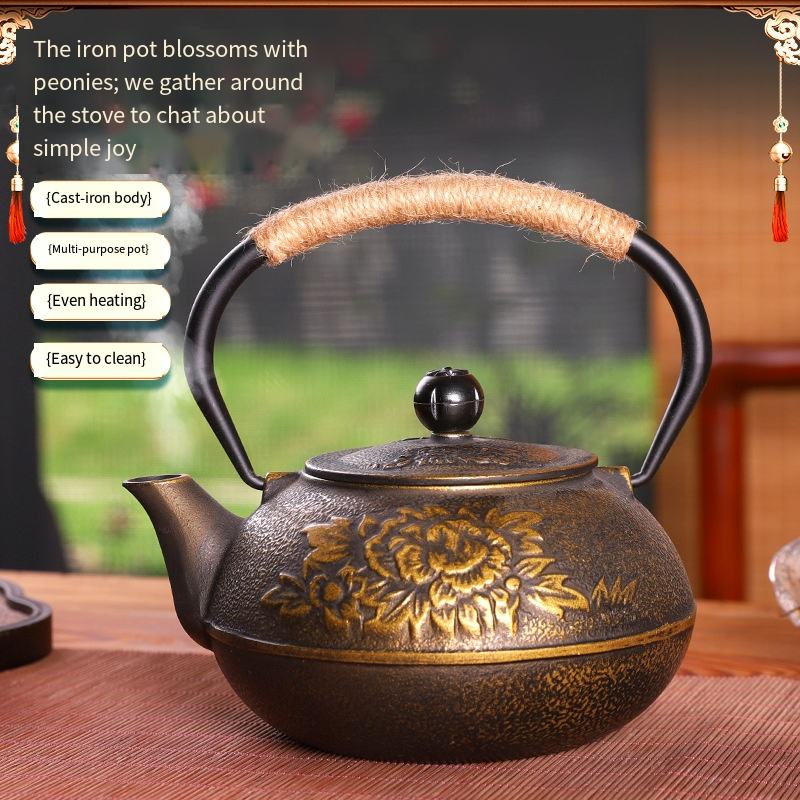ต้มน้ำชาในเตาทรงกลมพร้อมหม้อเหล็กหล่อลายดอกโบตั๋นแบบจีน ชุดน้ำชาเหล็กหล่อทำมือแบบไม่เคลือบ ของขวัญสุดพิเศษ
