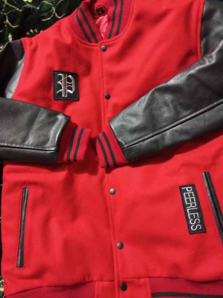 แจ็กเก็ตตัวแทนของผู้ชายมีกระดุมหลายเม็ดและแขนสีตัดกันสีแดงสีดำ