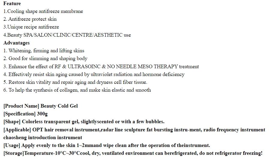 ครีมเจลเย็น RF อัลตราซาวด์ ไฮด์รอลิฟท์ โกลว์ เจลล์ แอนติฟรีซ ชิลด์ บิวตี้ โคลด์ เจล นวด คาวิ เวคคัม สำหรับร้านเสริมสวยและคลินิก