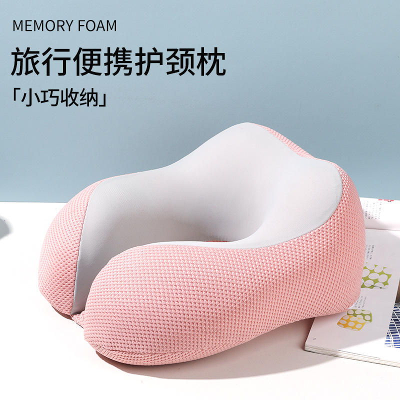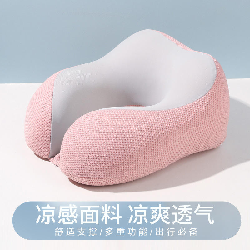 หมอนรองคอเมมโมรี่โฟมรูปตัวยูแบบเย็นสบาย สีฟ้าอ่อน ผ้าตาข่าย พกพาสะดวก พับได้ ใช้สำหรับเดินทางบนเครื่องบิน