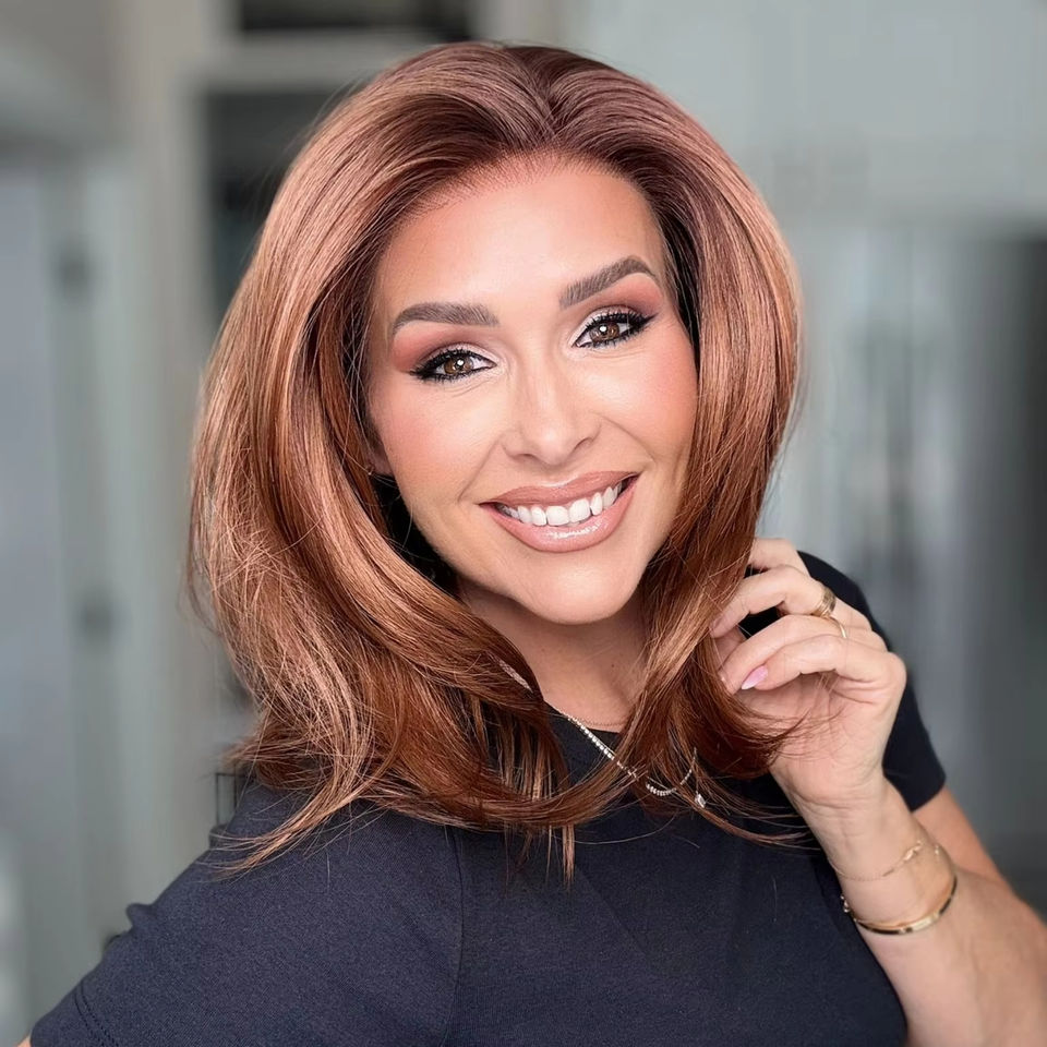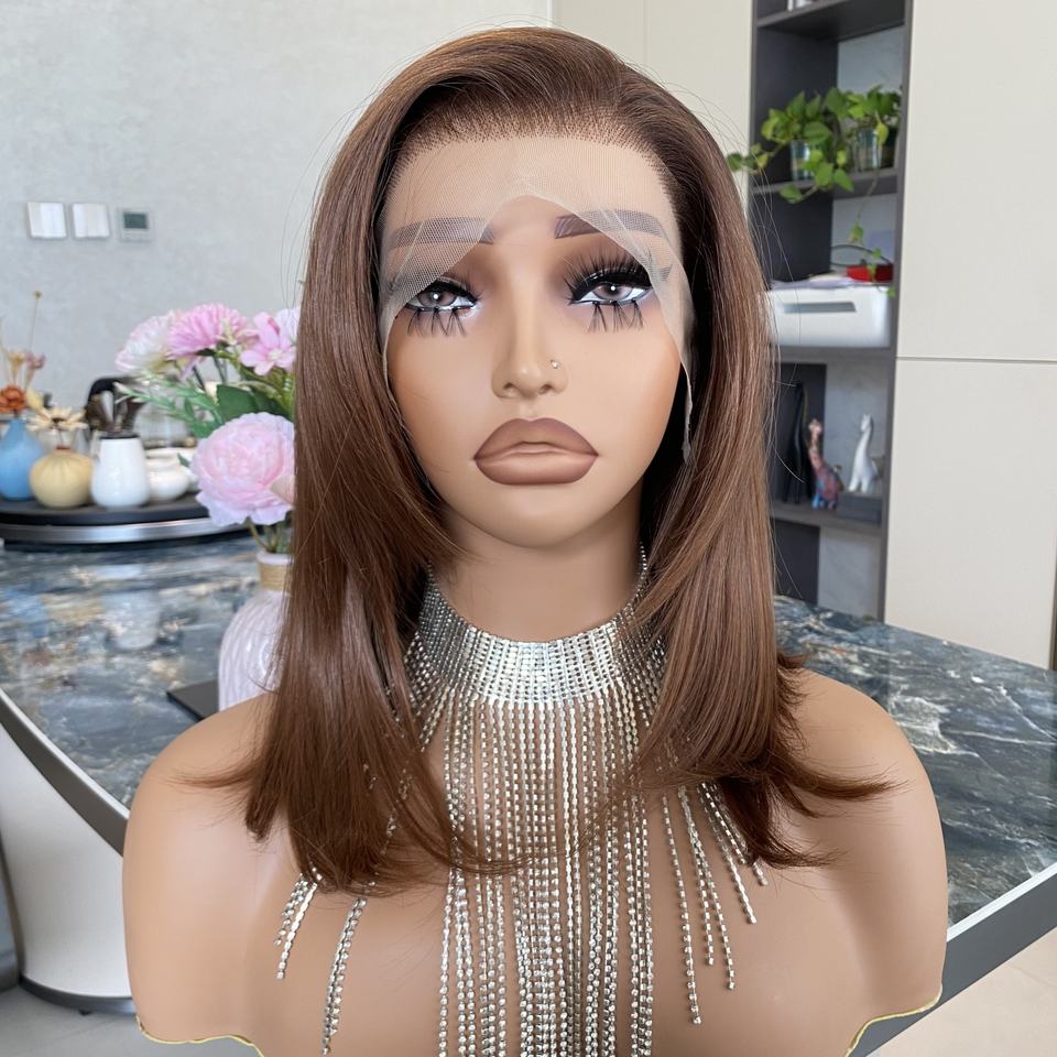 วิกผมสีน้ำตาลทองแดงแบบไม่ต้องใช้กาว วิกผมลูกไม้โปร่งใส 13x4 ทนความร้อน ทรงบ๊อบสั้นแบบลอน ถอนขนมาแล้ว ขนาด 10 นิ้ว วิกผมใยสังเคราะห์สำหรับผู้หญิงผิวสี