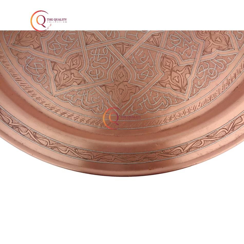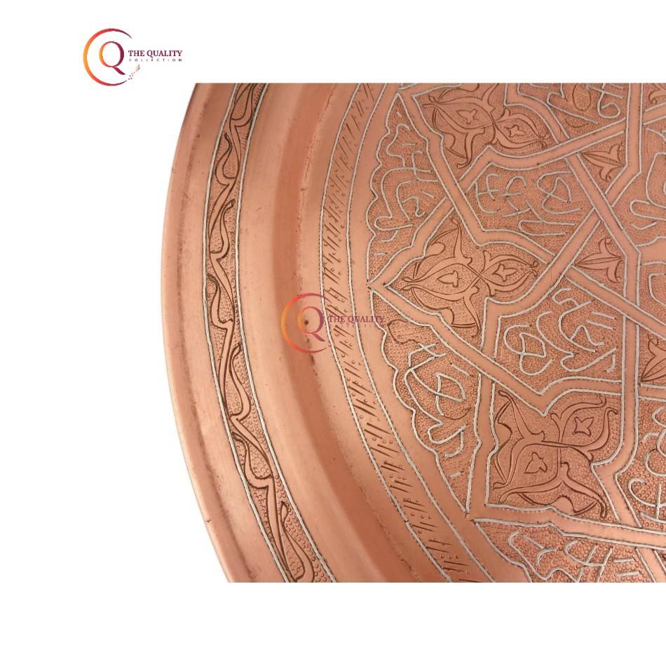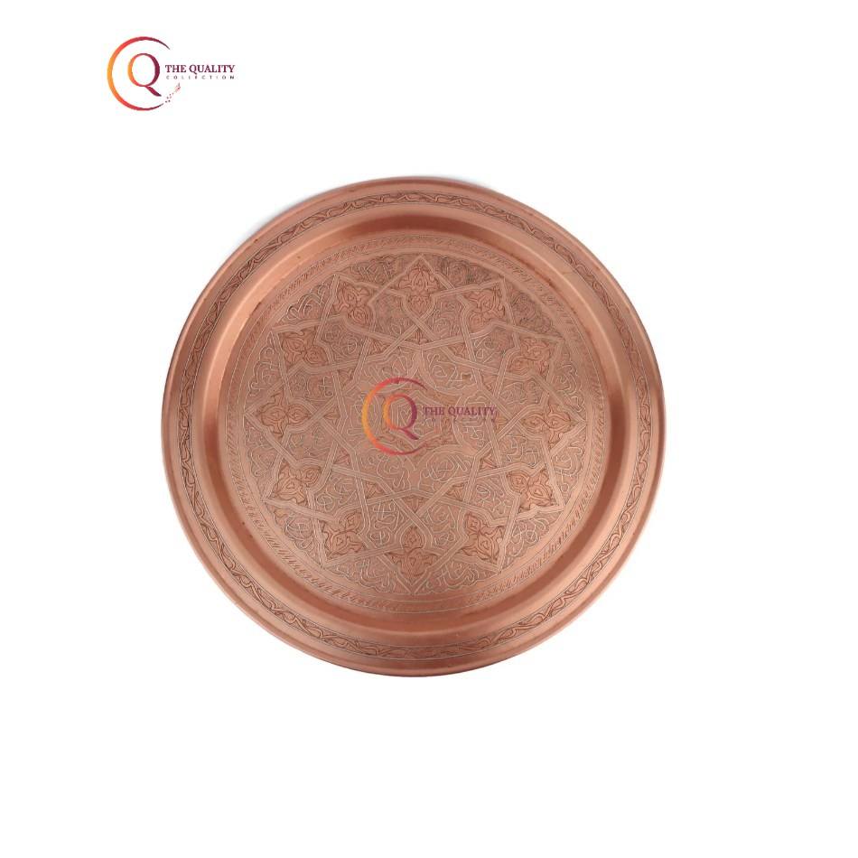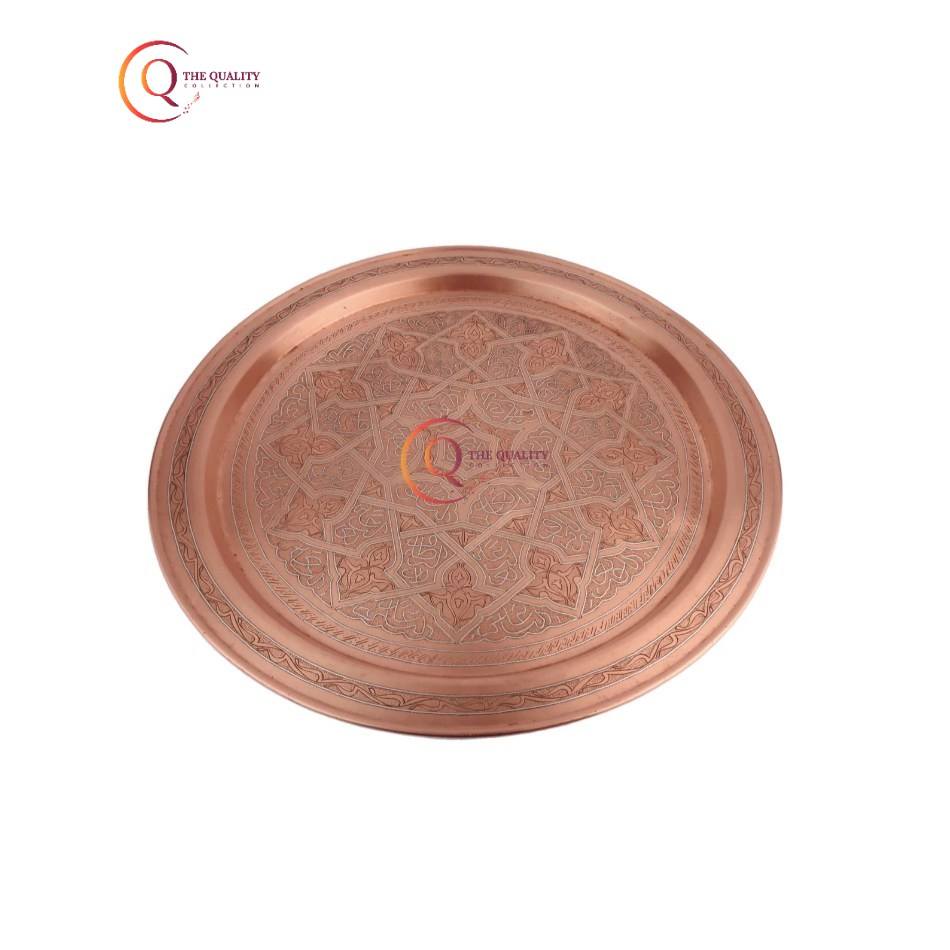 ถาดทองแดงสลักดีไซน์แบบไม่มีหูจับชุบทองแดงขัดเงาด้วยรูปทรงกลมสำหรับตกแต่งงานแต่งงานบนโต๊ะรูปทรงกลม