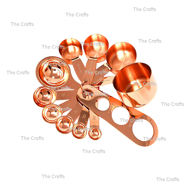 ถ้วยตวงทองแดงสีโรสโกลด์พร้อมเครื่องครัวสำหรับใช้ในบ้านขนาดแตกต่างกัน