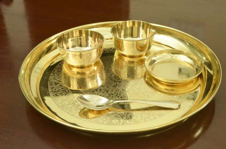 ทองแดงเหล็กมือทำแผ่นครัว Thali ชุดอาหารค่ำ7ชิ้นทองแดงบนโต๊ะอาหารชุดที่ให้บริการกษัตริย์นานาชาติ