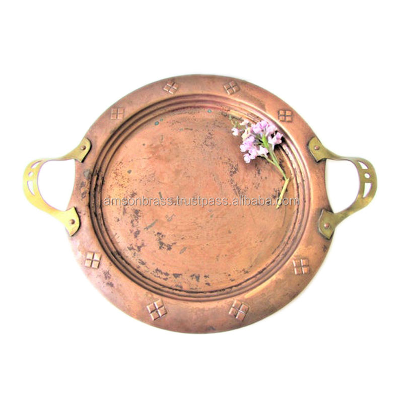 ถาดทองแดงล้วนแบบมีด้ามจับทรงกลมถาดเสิร์ฟอาหารพร้อมที่จับสำหรับตกแต่งบ้านโรงแรมร้านอาหาร