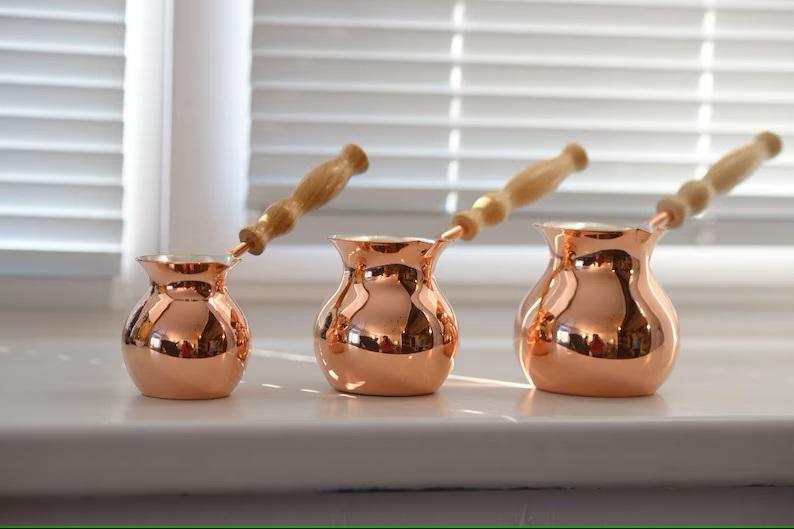 หม้อต้มกาแฟทองแดงแบบตุรกี ทำด้วยมือ เงางาม พร้อมด้ามจับไม้ ขายส่งเครื่องชงกาแฟ