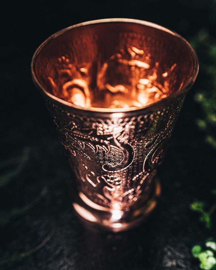 แก้วดื่มทองแดงที่ออกแบบมาให้มีสุนทรียภาพแบบดั้งเดิมสำหรับพิธีสุขภาพในชีวิตประจำวันและวัฒนธรรมอินเดียที่ได้แรงบันดาลใจในการตกแต่ง